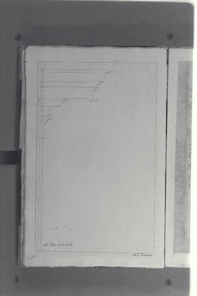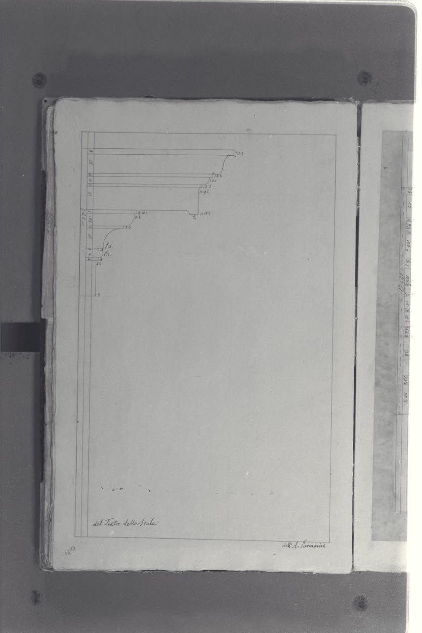 - NOTIZIE STORICO CRITICHE Il cosiddetto "Album Piermarini" è un taccuino di particolari e note, un fascicolo di 58 fogli (116 pagine) che raccoglie disegni e scritti riferiti a opere di Piermarini, Pellegrini, Segrè, Richino e Giocondo Albertolli; di questi, probabilmente nessuno è autografo di Piermarini. La sua impaginazione, la tecnica disegnativa impiegata in gran parte dei fogli e l'aspetto grafico sembrano quelli preparatori a incisioni per una pubblicazione: secondo parte della critica, potrebbe trattarsi di una bozza, redatta da un collaboratore (forse Marcellino Segrè), al fine di farne un manuale a uso dell'Accademia di Belle Arti. L'album è una copia del secondo dei due Zibaldoni di Giuseppe Piermarini, conservati presso la Biblioteca Comunale di Foligno con il titolo "Libro di appunti, ricordi, disegni vari".\nIl foglio mostra una cornice del Teatro alla Scala.