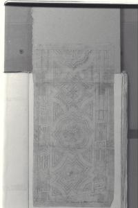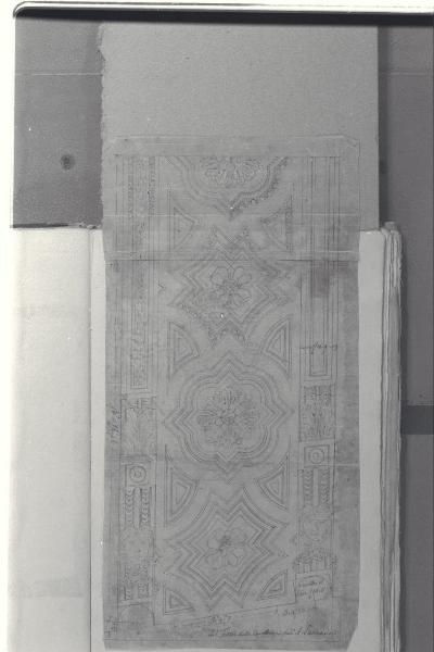 - NOTIZIE STORICO CRITICHE Il cosiddetto "Album Piermarini" è un taccuino di particolari e note, un fascicolo di 58 fogli (116 pagine) che raccoglie disegni e scritti riferiti a opere di Piermarini, Pellegrini, Segrè, Richino e Giocondo Albertolli; di questi, probabilmente nessuno è autografo di Piermarini. La sua impaginazione, la tecnica disegnativa impiegata in gran parte dei fogli e l'aspetto grafico sembrano quelli preparatori a incisioni per una pubblicazione: secondo parte della critica, potrebbe trattarsi di una bozza, redatta da un collaboratore (forse Marcellino Segrè), al fine di farne un manuale a uso dell'Accademia di Belle Arti. L'album è una copia del secondo dei due Zibaldoni di Giuseppe Piermarini, conservati presso la Biblioteca Comunale di Foligno con il titolo "Libro di appunti, ricordi, disegni vari".\nIl foglio mostra decorazioni per la volta del Teatro della Canobiana, su progetto del Piermarini.