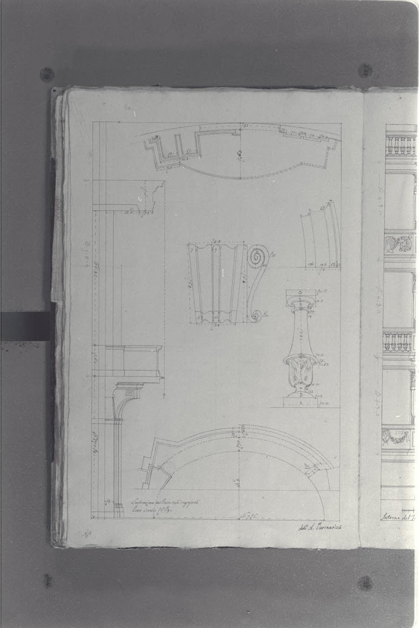 - NOTIZIE STORICO CRITICHE Il cosiddetto "Album Piermarini" è un taccuino di particolari e note, un fascicolo di 58 fogli (116 pagine) che raccoglie disegni e scritti riferiti a opere di Piermarini, Pellegrini, Segrè, Richino e Giocondo Albertolli; di questi, probabilmente nessuno è autografo di Piermarini. La sua impaginazione, la tecnica disegnativa impiegata in gran parte dei fogli e l'aspetto grafico sembrano quelli preparatori a incisioni per una pubblicazione: secondo parte della critica, potrebbe trattarsi di una bozza, redatta da un collaboratore (forse Marcellino Segrè), al fine di farne un manuale a uso dell'Accademia di Belle Arti. L'album è una copia del secondo dei due Zibaldoni di Giuseppe Piermarini, conservati presso la Biblioteca Comunale di Foligno con il titolo "Libro di appunti, ricordi, disegni vari".\nIl foglio mostra particolari del palco ducale (successivamente palco reale) del Teatro alla Scala. Il balaustro è raffigurato in prospettiva perché in questo modo vennero decorati i parapetti dei palchi, a ordini alternati.