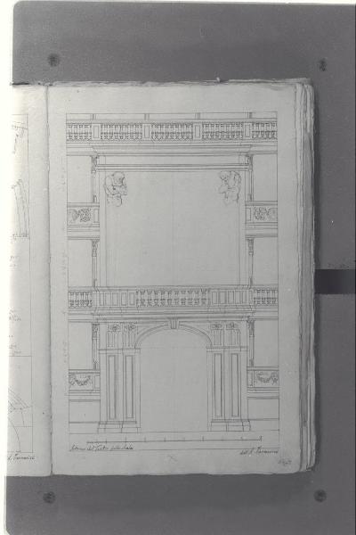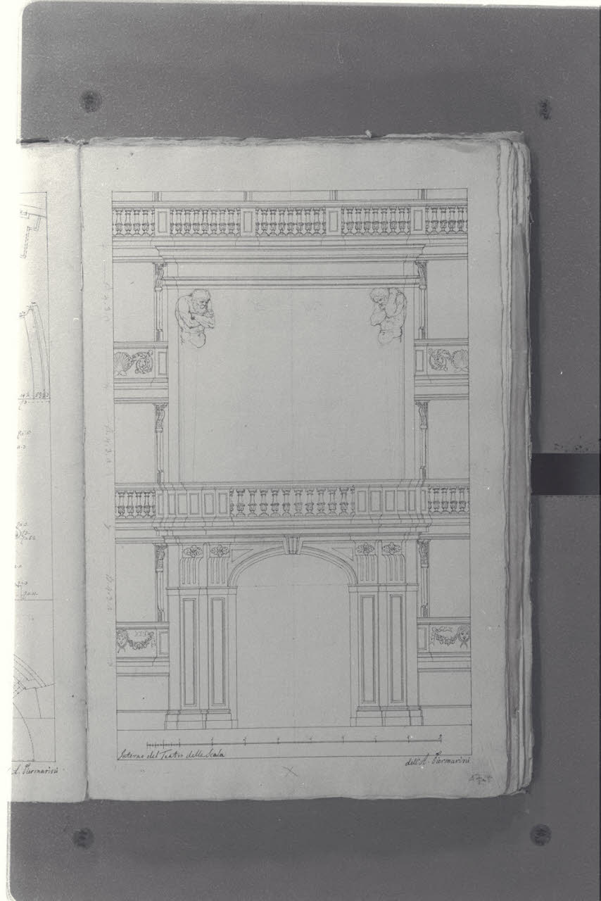 - NOTIZIE STORICO CRITICHE Il cosiddetto "Album Piermarini" è un taccuino di particolari e note, un fascicolo di 58 fogli (116 pagine) che raccoglie disegni e scritti riferiti a opere di Piermarini, Pellegrini, Segrè, Richino e Giocondo Albertolli; di questi, probabilmente nessuno è autografo di Piermarini. La sua impaginazione, la tecnica disegnativa impiegata in gran parte dei fogli e l'aspetto grafico sembrano quelli preparatori a incisioni per una pubblicazione: secondo parte della critica, potrebbe trattarsi di una bozza, redatta da un collaboratore (forse Marcellino Segrè), al fine di farne un manuale a uso dell'Accademia di Belle Arti. L'album è una copia del secondo dei due Zibaldoni di Giuseppe Piermarini, conservati presso la Biblioteca Comunale di Foligno con il titolo "Libro di appunti, ricordi, disegni vari".\nIl foglio mostra un alzato del palco ducale (successivamente palco reale). I due telamoni non sono terminati.