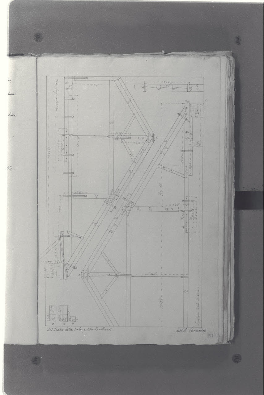 - NOTIZIE STORICO CRITICHE Il cosiddetto "Album Piermarini" è un taccuino di particolari e note, un fascicolo di 58 fogli (116 pagine) che raccoglie disegni e scritti riferiti a opere di Piermarini, Pellegrini, Segrè, Richino e Giocondo Albertolli; di questi, probabilmente nessuno è autografo di Piermarini. La sua impaginazione, la tecnica disegnativa impiegata in gran parte dei fogli e l'aspetto grafico sembrano quelli preparatori a incisioni per una pubblicazione: secondo parte della critica, potrebbe trattarsi di una bozza, redatta da un collaboratore (forse Marcellino Segrè), al fine di farne un manuale a uso dell'Accademia di Belle Arti. L'album è una copia del secondo dei due Zibaldoni di Giuseppe Piermarini, conservati presso la Biblioteca Comunale di Foligno con il titolo "Libro di appunti, ricordi, disegni vari".\nIl rilievo mostra le capriate lignee del Teatro alla Scala e del Teatro della Canobiana (Teatro Lirico).