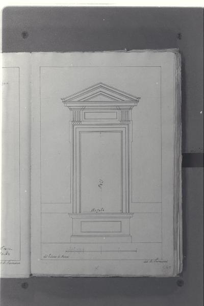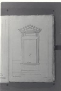 - NOTIZIE STORICO CRITICHE Il cosiddetto "Album Piermarini" è un taccuino di particolari e note, un fascicolo di 58 fogli (116 pagine) che raccoglie disegni e scritti riferiti a opere di Piermarini, Pellegrini, Segrè, Richino e Giocondo Albertolli; di questi, probabilmente nessuno è autografo di Piermarini. La sua impaginazione, la tecnica disegnativa impiegata in gran parte dei fogli e l'aspetto grafico sembrano quelli preparatori a incisioni per una pubblicazione: secondo parte della critica, potrebbe trattarsi di una bozza, redatta da un collaboratore (forse Marcellino Segrè), al fine di farne un manuale a uso dell'Accademia di Belle Arti. L'album è una copia del secondo dei due Zibaldoni di Giuseppe Piermarini, conservati presso la Biblioteca Comunale di Foligno con il titolo "Libro di appunti, ricordi, disegni vari".\nIl foglio illustra il rilievo di una finestra di Villa Reale di Monza, su progetto del Piermarini.