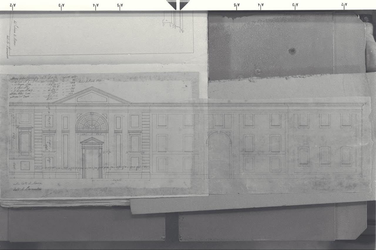 - NOTIZIE STORICO CRITICHE Il cosiddetto "Album Piermarini" è un taccuino di particolari e note, un fascicolo di 58 fogli (116 pagine) che raccoglie disegni e scritti riferiti a opere di Piermarini, Pellegrini, Segrè, Richino e Giocondo Albertolli; di questi, probabilmente nessuno è autografo di Piermarini. La sua impaginazione, la tecnica disegnativa impiegata in gran parte dei fogli e l'aspetto grafico sembrano quelli preparatori a incisioni per una pubblicazione: secondo parte della critica, potrebbe trattarsi di una bozza, redatta da un collaboratore (forse Marcellino Segrè), al fine di farne un manuale a uso dell'Accademia di Belle Arti. L'album è una copia del secondo dei due Zibaldoni di Giuseppe Piermarini, conservati presso la Biblioteca Comunale di Foligno con il titolo "Libro di appunti, ricordi, disegni vari".\nIl foglio illustra il prospetto di una facciata della corte della Villa Reale di Monza, su progetto del Piermarini.