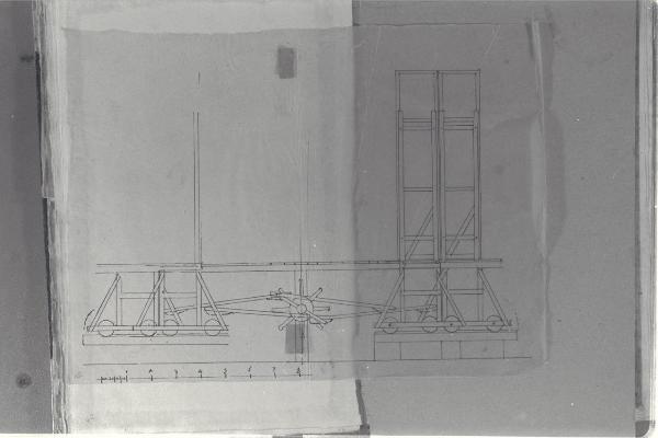 - NOTIZIE STORICO CRITICHE Il cosiddetto "Album Piermarini" è un taccuino di particolari e note, un fascicolo di 58 fogli (116 pagine) che raccoglie disegni e scritti riferiti a opere di Piermarini, Pellegrini, Segrè, Richino e Giocondo Albertolli; di questi, probabilmente nessuno è autografo di Piermarini. La sua impaginazione, la tecnica disegnativa impiegata in gran parte dei fogli e l'aspetto grafico sembrano quelli preparatori a incisioni per una pubblicazione: secondo parte della critica, potrebbe trattarsi di una bozza, redatta da un collaboratore (forse Marcellino Segrè), al fine di farne un manuale a uso dell'Accademia di Belle Arti. L'album è una copia del secondo dei due Zibaldoni di Giuseppe Piermarini, conservati presso la Biblioteca Comunale di Foligno con il titolo "Libro di appunti, ricordi, disegni vari".\nIl foglio mostra un dispositivo scenico che permetteva di montare su quattro carrelli due coppie di quinte teatrali.