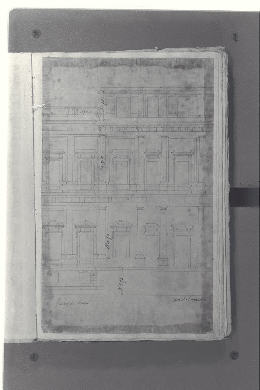 - NOTIZIE STORICO CRITICHE Il cosiddetto "Album Piermarini" è un taccuino di particolari e note, un fascicolo di 58 fogli (116 pagine) che raccoglie disegni e scritti riferiti a opere di Piermarini, Pellegrini, Segrè, Richino e Giocondo Albertolli; di questi, probabilmente nessuno è autografo di Piermarini. La sua impaginazione, la tecnica disegnativa impiegata in gran parte dei fogli e l'aspetto grafico sembrano quelli preparatori a incisioni per una pubblicazione: secondo parte della critica, potrebbe trattarsi di una bozza, redatta da un collaboratore (forse Marcellino Segrè), al fine di farne un manuale a uso dell'Accademia di Belle Arti. L'album è una copia del secondo dei due Zibaldoni di Giuseppe Piermarini, conservati presso la Biblioteca Comunale di Foligno con il titolo "Libro di appunti, ricordi, disegni vari".\nIl foglio mostra il prospetto di una facciata della Villa Reale di Monza, su progetto del Piermarini.