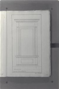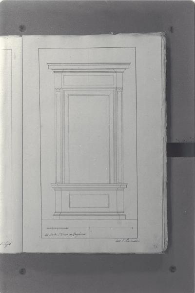 - NOTIZIE STORICO CRITICHE Il cosiddetto "Album Piermarini" è un taccuino di particolari e note, un fascicolo di 58 fogli (116 pagine) che raccoglie disegni e scritti riferiti a opere di Piermarini, Pellegrini, Segrè, Richino e Giocondo Albertolli; di questi, probabilmente nessuno è autografo di Piermarini. La sua impaginazione, la tecnica disegnativa impiegata in gran parte dei fogli e l'aspetto grafico sembrano quelli preparatori a incisioni per una pubblicazione: secondo parte della critica, potrebbe trattarsi di una bozza, redatta da un collaboratore (forse Marcellino Segrè), al fine di farne un manuale a uso dell'Accademia di Belle Arti. L'album è una copia del secondo dei due Zibaldoni di Giuseppe Piermarini, conservati presso la Biblioteca Comunale di Foligno con il titolo "Libro di appunti, ricordi, disegni vari".\nIl foglio illustra il rilievo di una finestra del Monte di Santa Teresa, su progetto del Piermarini.