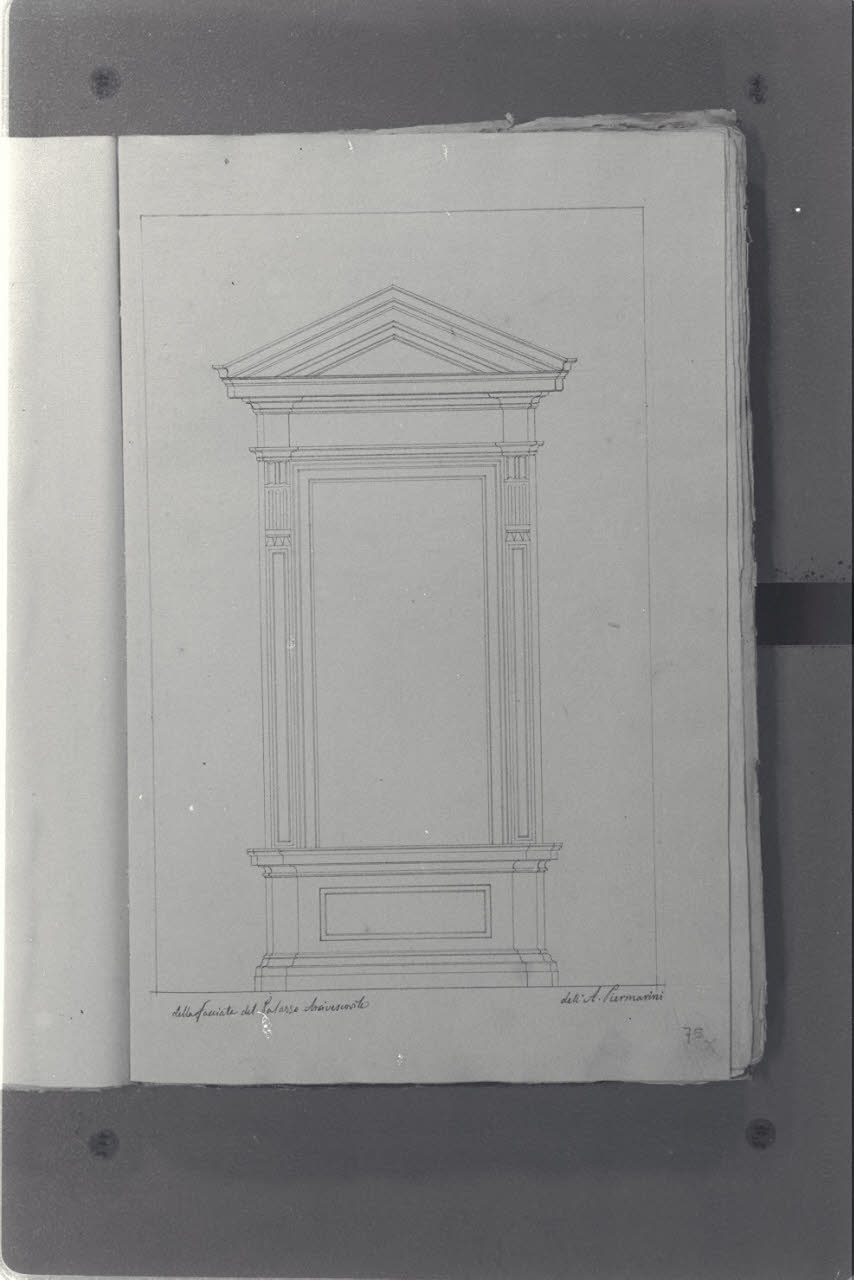 - NOTIZIE STORICO CRITICHE Il cosiddetto "Album Piermarini" è un taccuino di particolari e note, un fascicolo di 58 fogli (116 pagine) che raccoglie disegni e scritti riferiti a opere di Piermarini, Pellegrini, Segrè, Richino e Giocondo Albertolli; di questi, probabilmente nessuno è autografo di Piermarini. La sua impaginazione, la tecnica disegnativa impiegata in gran parte dei fogli e l'aspetto grafico sembrano quelli preparatori a incisioni per una pubblicazione: secondo parte della critica, potrebbe trattarsi di una bozza, redatta da un collaboratore (forse Marcellino Segrè), al fine di farne un manuale a uso dell'Accademia di Belle Arti. L'album è una copia del secondo dei due Zibaldoni di Giuseppe Piermarini, conservati presso la Biblioteca Comunale di Foligno con il titolo "Libro di appunti, ricordi, disegni vari".\nIl foglio illustra il rilievo di una finestra del primo piano della facciata dell'Arcivescovado a Milano, su progetto del Piermarini.