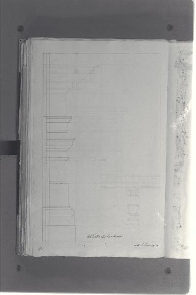 - NOTIZIE STORICO CRITICHE Il cosiddetto "Album Piermarini" è un taccuino di particolari e note, un fascicolo di 58 fogli (116 pagine) che raccoglie disegni e scritti riferiti a opere di Piermarini, Pellegrini, Segrè, Richino e Giocondo Albertolli; di questi, probabilmente nessuno è autografo di Piermarini. La sua impaginazione, la tecnica disegnativa impiegata in gran parte dei fogli e l'aspetto grafico sembrano quelli preparatori a incisioni per una pubblicazione: secondo parte della critica, potrebbe trattarsi di una bozza, redatta da un collaboratore (forse Marcellino Segrè), al fine di farne un manuale a uso dell'Accademia di Belle Arti. L'album è una copia del secondo dei due Zibaldoni di Giuseppe Piermarini, conservati presso la Biblioteca Comunale di Foligno con il titolo "Libro di appunti, ricordi, disegni vari".\nIl foglio illustra alcuni Dettagli architettonici del Teatro della Canobiana, su progetto del Piermarini.