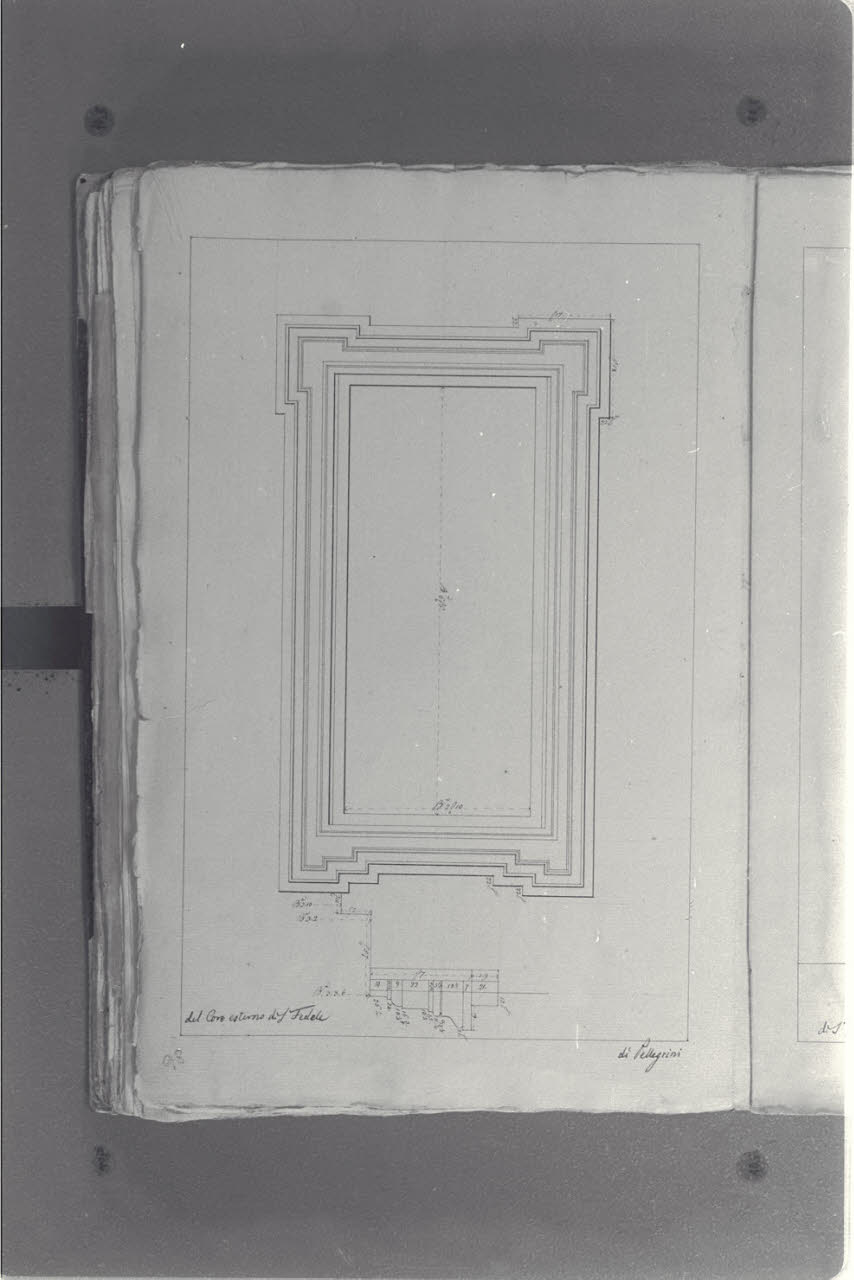 - NOTIZIE STORICO CRITICHE Il cosiddetto "Album Piermarini" è un taccuino di particolari e note, un fascicolo di 58 fogli (116 pagine) che raccoglie disegni e scritti riferiti a opere di Piermarini, Pellegrini, Segrè, Richino e Giocondo Albertolli; di questi, probabilmente nessuno è autografo di Piermarini. La sua impaginazione, la tecnica disegnativa impiegata in gran parte dei fogli e l'aspetto grafico sembrano quelli preparatori a incisioni per una pubblicazione: secondo parte della critica, potrebbe trattarsi di una bozza, redatta da un collaboratore (forse Marcellino Segrè), al fine di farne un manuale a uso dell'Accademia di Belle Arti. L'album è una copia del secondo dei due Zibaldoni di Giuseppe Piermarini, conservati presso la Biblioteca Comunale di Foligno con il titolo "Libro di appunti, ricordi, disegni vari".\nIl foglio mostra un dettaglio del coro esterno della chiesa di San Fedele a Milano, su progetto di Pellegrino de' Pellegrini detto il Tibaldi.