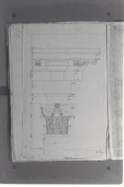 - NOTIZIE STORICO CRITICHE Il cosiddetto "Album Piermarini" è un taccuino di particolari e note, un fascicolo di 58 fogli (116 pagine) che raccoglie disegni e scritti riferiti a opere di Piermarini, Pellegrini, Segrè, Richino e Giocondo Albertolli; di questi, probabilmente nessuno è autografo di Piermarini. La sua impaginazione, la tecnica disegnativa impiegata in gran parte dei fogli e l'aspetto grafico sembrano quelli preparatori a incisioni per una pubblicazione: secondo parte della critica, potrebbe trattarsi di una bozza, redatta da un collaboratore (forse Marcellino Segrè), al fine di farne un manuale a uso dell'Accademia di Belle Arti. L'album è una copia del secondo dei due Zibaldoni di Giuseppe Piermarini, conservati presso la Biblioteca Comunale di Foligno con il titolo "Libro di appunti, ricordi, disegni vari".\nIl foglio illustra un dettaglio di capitello composito della chiesa di San Fedele a Milano, su progetto di Pellegrino de' Pellegrini detto il Tibaldi.