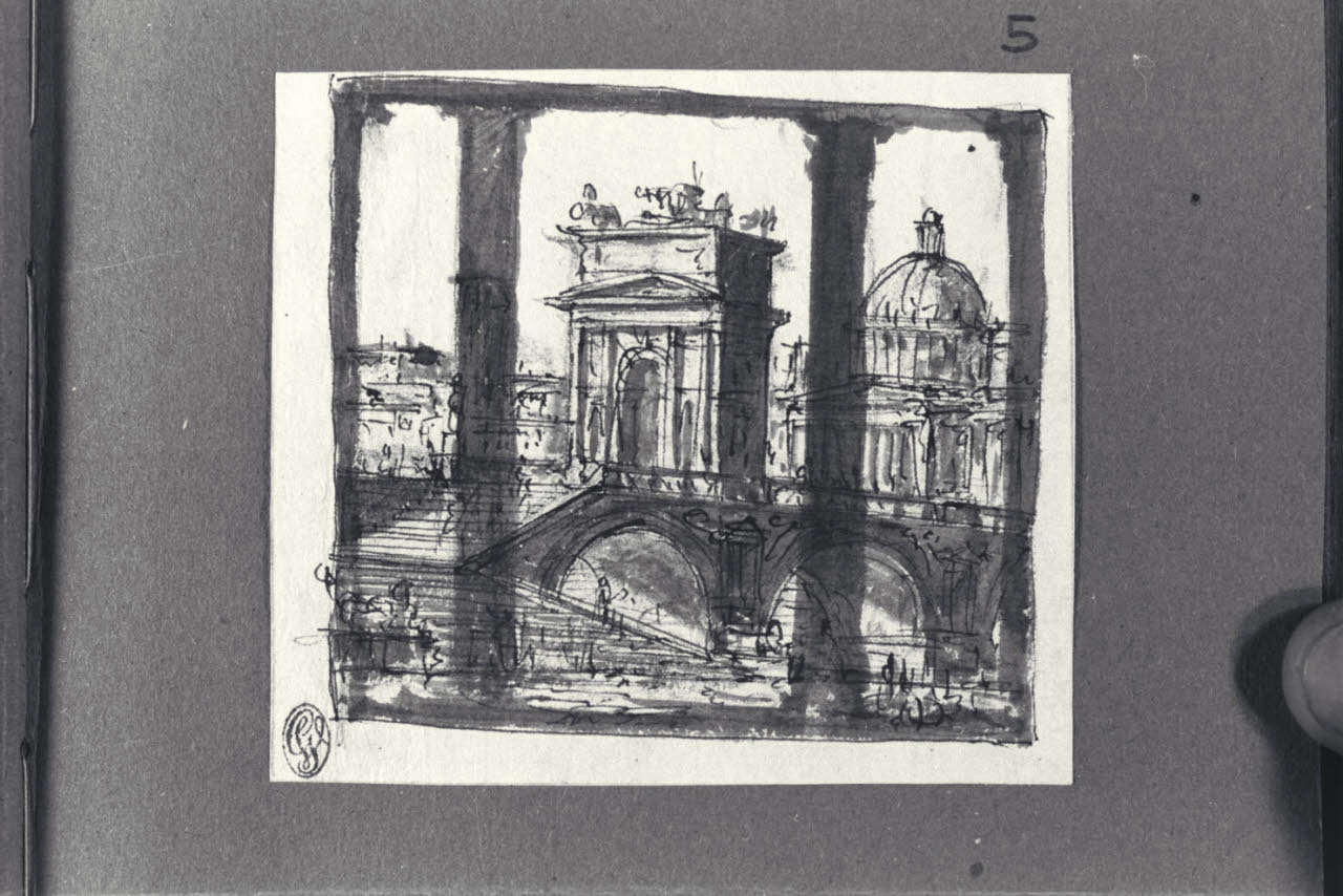 - NOTIZIE STORICO CRITICHE Il disegno fa parte di un piccolo album Vallardi del 1840, di dimensioni mm 160 x 175, sulla cui copertina in pelle marrone chiaro è incisa l'iscrizione in lettere capitali dorate "Paolo Landriani / milanese / e suoi contemporanei / nell'arte prospettica valentissimi / questi loro disegni / Giuseppe Vallardi / raccolse per tramandare / co' passati maestri a' futuri / la stabile rinomanza / della scuola lombarda / l'anno MDCCCXL". Ogni singolo disegno è incollato a un foglio dell'album di carta di colore grigio-azzurro.