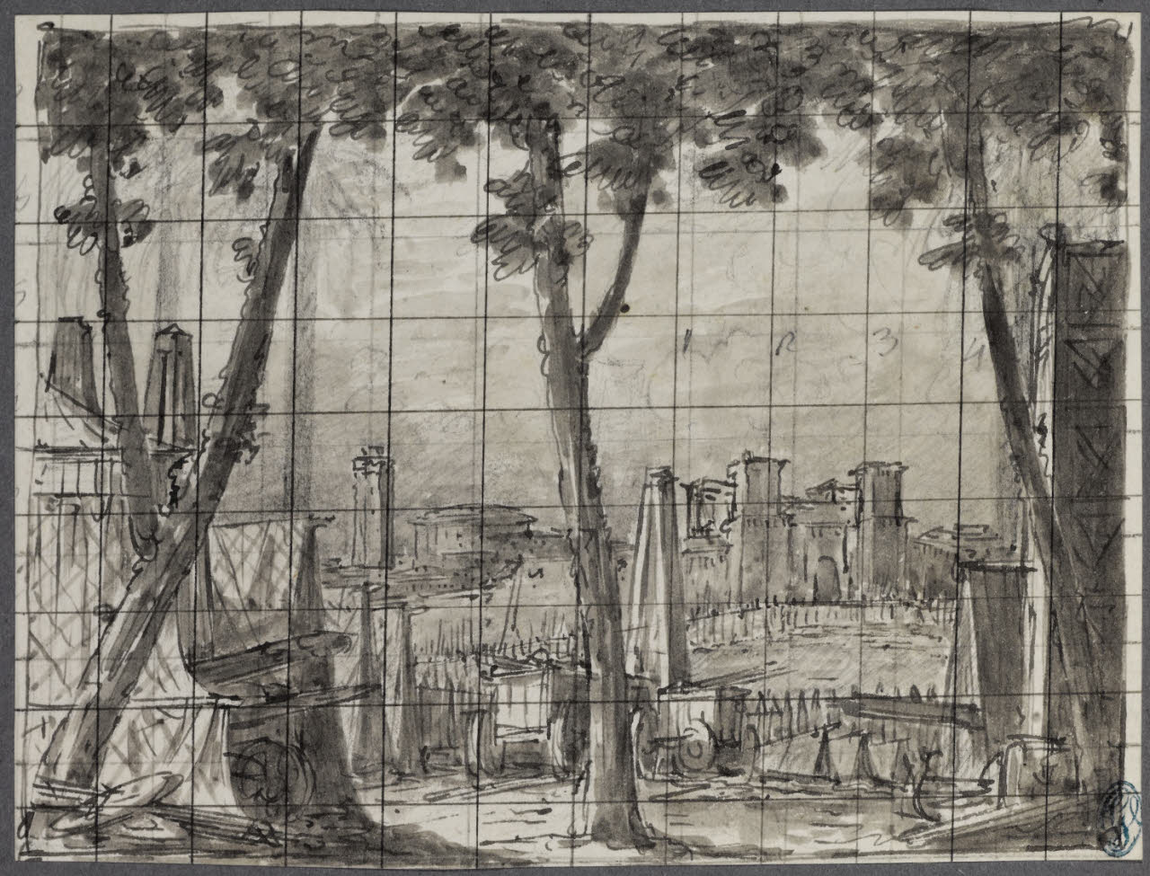 - NOTIZIE STORICO CRITICHE Il disegno fa parte di un piccolo album Vallardi del 1840, di dimensioni mm 160 x 175, sulla cui copertina in pelle marrone chiaro è incisa l'iscrizione in lettere capitali dorate "Paolo Landriani / milanese / e suoi contemporanei / nell'arte prospettica valentissimi / questi loro disegni / Giuseppe Vallardi / raccolse per tramandare / co' passati maestri a' futuri / la stabile rinomanza / della scuola lombarda / l'anno MDCCCXL". Ogni singolo disegno è incollato a un foglio dell'album di carta di colore grigio-azzurro.\nL'opera è uno studio per la scenografia del melodramma serio in due atti "Annibale in Capua", su musica di Giuseppe Farinelli e libretto di Luigi Romanelli, rappresentato per la prima volta al Teatro alla Scala il 26 dicembre 1810. La griglia che compare nel disegno era utilizzata per riportare le misura in scala sulle scenografie teatrali dipinte.