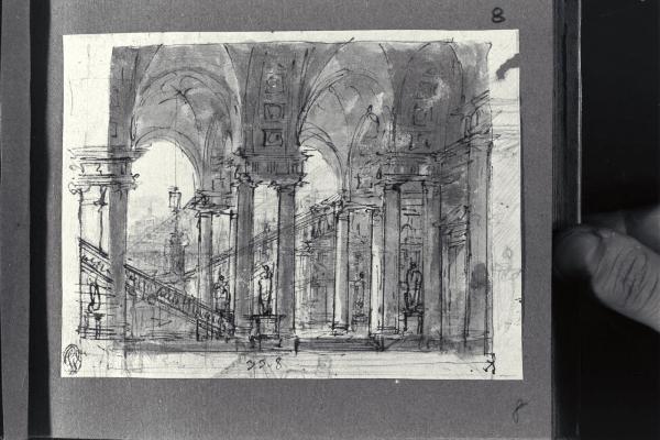 - NOTIZIE STORICO CRITICHE Il disegno fa parte di un piccolo album Vallardi del 1840, di dimensioni mm 160 x 175, sulla cui copertina in pelle marrone chiaro è incisa l'iscrizione in lettere capitali dorate "Paolo Landriani / milanese / e suoi contemporanei / nell'arte prospettica valentissimi / questi loro disegni / Giuseppe Vallardi / raccolse per tramandare / co' passati maestri a' futuri / la stabile rinomanza / della scuola lombarda / l'anno MDCCCXL". Ogni singolo disegno è incollato a un foglio dell'album di carta di colore grigio-azzurro.