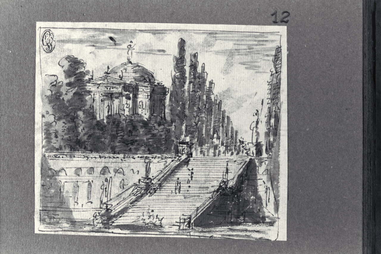 - NOTIZIE STORICO CRITICHE Il disegno fa parte di un piccolo album Vallardi del 1840, di dimensioni mm 160 x 175, sulla cui copertina in pelle marrone chiaro è incisa l'iscrizione in lettere capitali dorate "Paolo Landriani / milanese / e suoi contemporanei / nell'arte prospettica valentissimi / questi loro disegni / Giuseppe Vallardi / raccolse per tramandare / co' passati maestri a' futuri / la stabile rinomanza / della scuola lombarda / l'anno MDCCCXL". Ogni singolo disegno è incollato a un foglio dell'album di carta di colore grigio-azzurro.