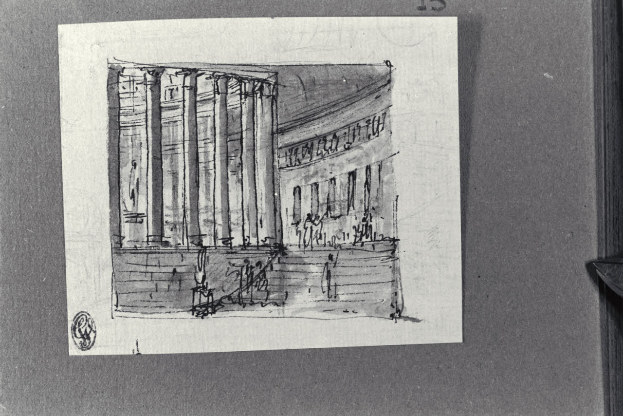 - NOTIZIE STORICO CRITICHE Il disegno fa parte di un piccolo album Vallardi del 1840, di dimensioni mm 160 x 175, sulla cui copertina in pelle marrone chiaro è incisa l'iscrizione in lettere capitali dorate "Paolo Landriani / milanese / e suoi contemporanei / nell'arte prospettica valentissimi / questi loro disegni / Giuseppe Vallardi / raccolse per tramandare / co' passati maestri a' futuri / la stabile rinomanza / della scuola lombarda / l'anno MDCCCXL". Ogni singolo disegno è incollato a un foglio dell'album di carta di colore grigio-azzurro.\nIl disegno presenta, sul verso, uno schizzo architettonico a penna e inchiostro nero.