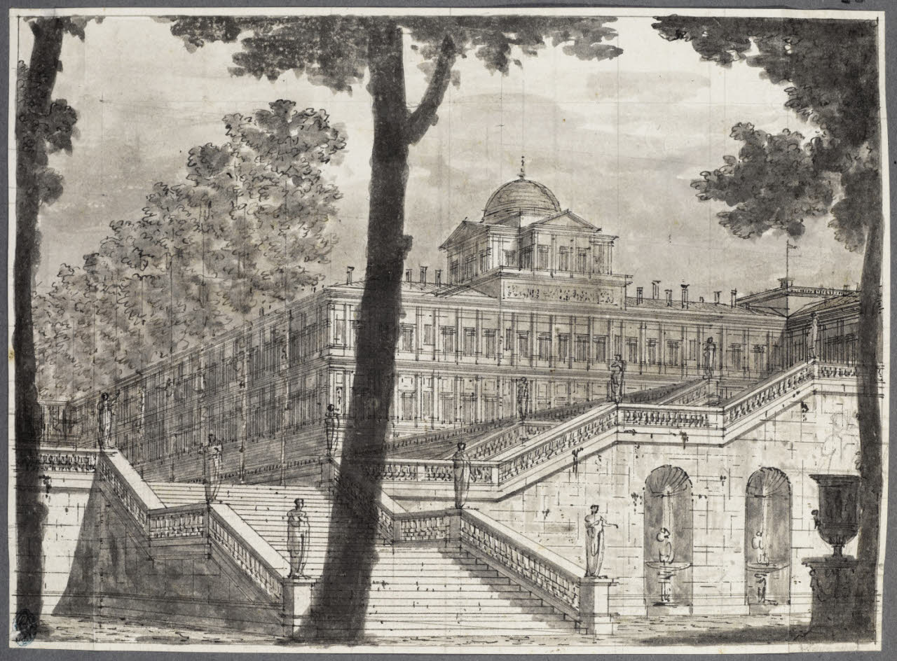 - NOTIZIE STORICO CRITICHE Il disegno fa parte di un album Vallardi del 1840, di dimensioni mm 254 x 295, sulla cui copertina in pelle marrone chiaro è incisa l'iscrizione in lettere capitali dorate "Paolo Landriani / milanese / e suoi contemporanei / nell'arte prospettica valentissimi / questi loro disegni / Giuseppe Vallardi / raccolse per tramandare / co' passati maestri a' futuri / la stabile rinomanza / della scuola lombarda / l'anno MDCCCXL". Ogni singolo disegno è incollato a un foglio dell'album di carta di colore grigio-azzurro.\nDa un confronto con un'incisione della "Raccolta di varie scene eseguite da' più celebri pittori teatrali in Milano", pubblicata nel 1852, si è dedotto che il disegno è il bozzetto della scena XIII dell'atto II dell'opera "Aureliano in Palmira", dramma serio per musica in due atti su musica di Gioachino Rossini e libretto di Felice Romani, rappresentata per la prima volta al Teatro alla Scala di Milano il 26 dicembre 1813. L’azione scenica trae spunto dagli avvenimenti del 272 d.C., durante la riconquista da parte dell’imperatore di Roma Aureliano dei vasti territori occupati in Oriente da Zenobia, vedova del re di Palmira e da lei governati in nome di suo figlio minorenne. Il foglio in analisi mostra coincidenze con la suddetta incisione, quali l'ambientazione, la scalinata, gli alberi, le fontane inserite nelle nicchie, il maestoso palazzo e l'atmosfera notturna al chiaro di luna voluta dal libretto; rispetto ad essa, però, nel disegno il grande palazzo ha eleganti fattezze neocinquecentesche, lontane dalla freddezza dell'incisione. Come si apprende dalla trama dell'opera, nella scena in analisi avviene un incontro tra i due innamorati, Zenobia regina di Palmira e il principe di Persia Arsace, prima che vengano imprigionati dai Romani per volere dell'imperatore Aureliano.