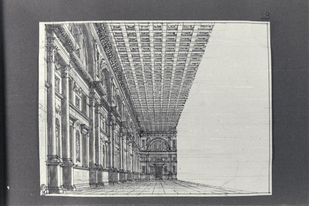 - NOTIZIE STORICO CRITICHE Il disegno fa parte di un album Vallardi del 1840, di dimensioni mm 254 x 295, sulla cui coptimbroertina in pelle marrone chiaro è incisa l'iscrizione in lettere capitali dorate "Paolo Landriani / milanese / e suoi contemporanei / nell'arte prospettica valentissimi / questi loro disegni / Giuseppe Vallardi / raccolse per tramandare / co' passati maestri a' futuri / la stabile rinomanza / della scuola lombarda / l'anno MDCCCXL". Ogni singolo disegno è incollato a un foglio dell'album di carta di colore grigio-azzurro.