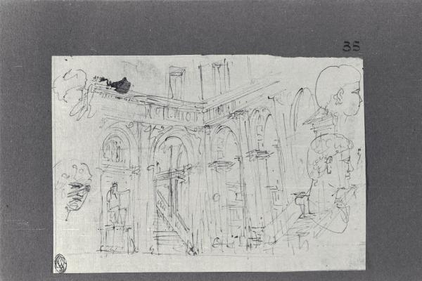 - NOTIZIE STORICO CRITICHE Il disegno fa parte di un album Vallardi del 1840, di dimensioni mm 254 x 295, sulla cui copertina in pelle marrone chiaro è incisa l'iscrizione in lettere capitali dorate "Paolo Landriani / milanese / e suoi contemporanei / nell'arte prospettica valentissimi / questi loro disegni / Giuseppe Vallardi / raccolse per tramandare / co' passati maestri a' futuri / la stabile rinomanza / della scuola lombarda / l'anno MDCCCXL". Ogni singolo disegno è incollato a un foglio dell'album di carta di colore grigio-azzurro.\nIl disegno presenta, sul verso, schizzi architettonici a penna e inchiostro e a pennello e inchiostro diluito (marrone, grigio).