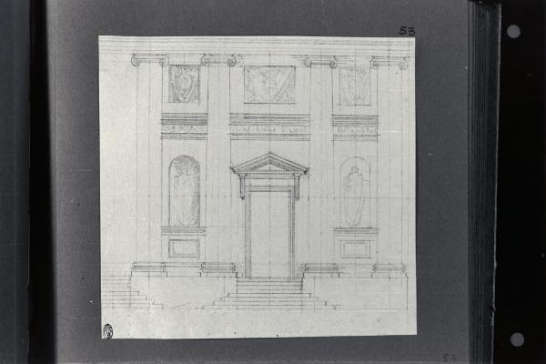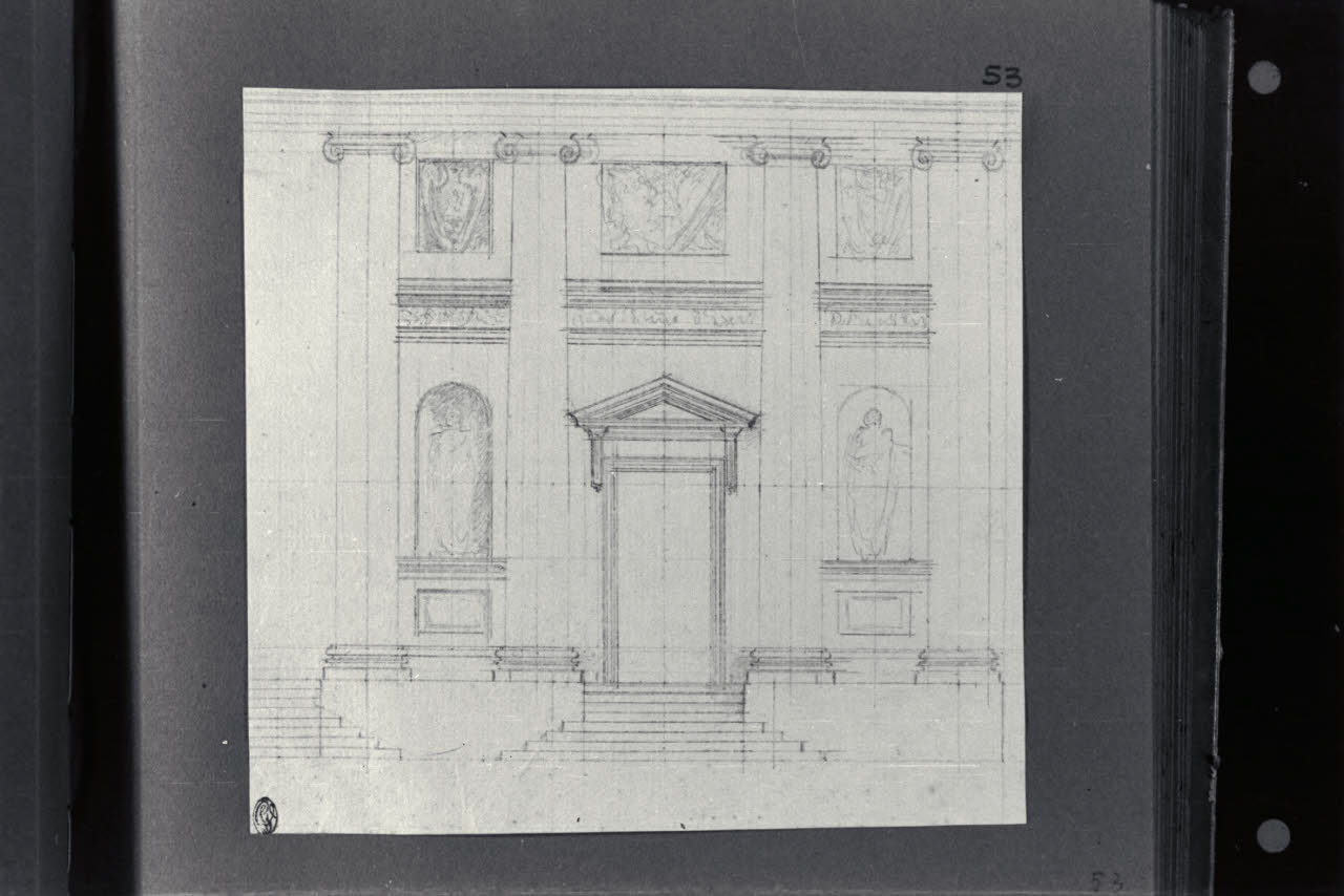 - NOTIZIE STORICO CRITICHE Il disegno fa parte di un album Vallardi del 1840, di dimensioni mm 254 x 295, sulla cui copertina in pelle marrone chiaro è incisa l'iscrizione in lettere capitali dorate "Paolo Landriani / milanese / e suoi contemporanei / nell'arte prospettica valentissimi / questi loro disegni / Giuseppe Vallardi / raccolse per tramandare / co' passati maestri a' futuri / la stabile rinomanza / della scuola lombarda / l'anno MDCCCXL". Ogni singolo disegno è incollato a un foglio dell'album di carta di colore grigio-azzurro.