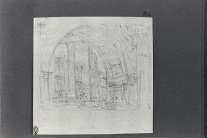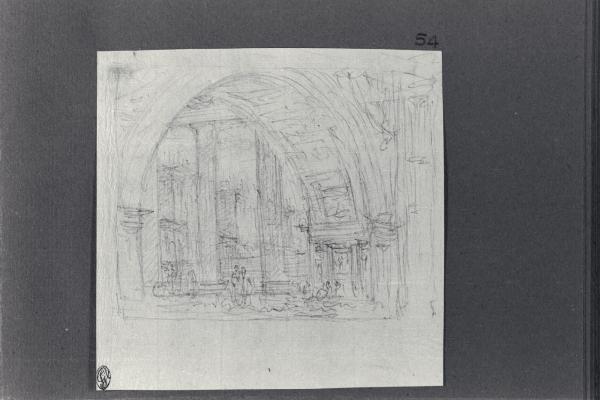 - NOTIZIE STORICO CRITICHE Il disegno fa parte di un album Vallardi del 1840, di dimensioni mm 254 x 295, sulla cui copertina in pelle marrone chiaro è incisa l'iscrizione in lettere capitali dorate "Paolo Landriani / milanese / e suoi contemporanei / nell'arte prospettica valentissimi / questi loro disegni / Giuseppe Vallardi / raccolse per tramandare / co' passati maestri a' futuri / la stabile rinomanza / della scuola lombarda / l'anno MDCCCXL". Ogni singolo disegno è incollato a un foglio dell'album di carta di colore grigio-azzurro.\nIl disegno presenta, sul verso, uno schizzo architettonico con figurine, realizzato a grafite.