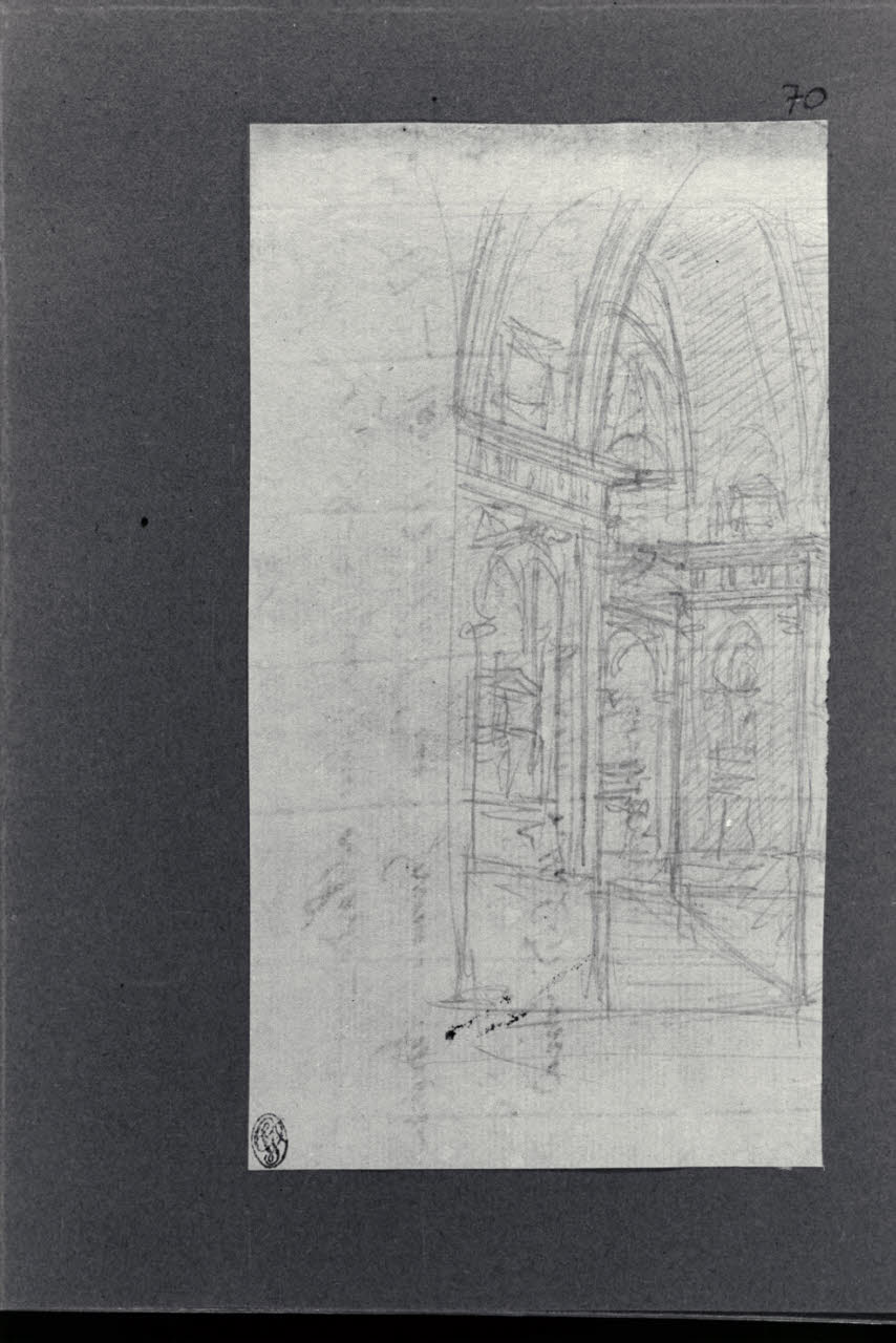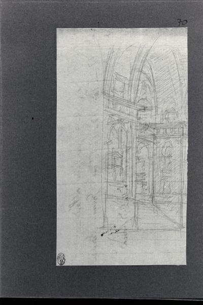 - NOTIZIE STORICO CRITICHE Il disegno fa parte di un album Vallardi del 1840, di dimensioni mm 254 x 295, sulla cui copertina in pelle marrone chiaro è incisa l'iscrizione in lettere capitali dorate "Paolo Landriani / milanese / e suoi contemporanei / nell'arte prospettica valentissimi / questi loro disegni / Giuseppe Vallardi / raccolse per tramandare / co' passati maestri a' futuri / la stabile rinomanza / della scuola lombarda / l'anno MDCCCXL". Ogni singolo disegno è incollato a un foglio dell'album di carta di colore grigio-azzurro.