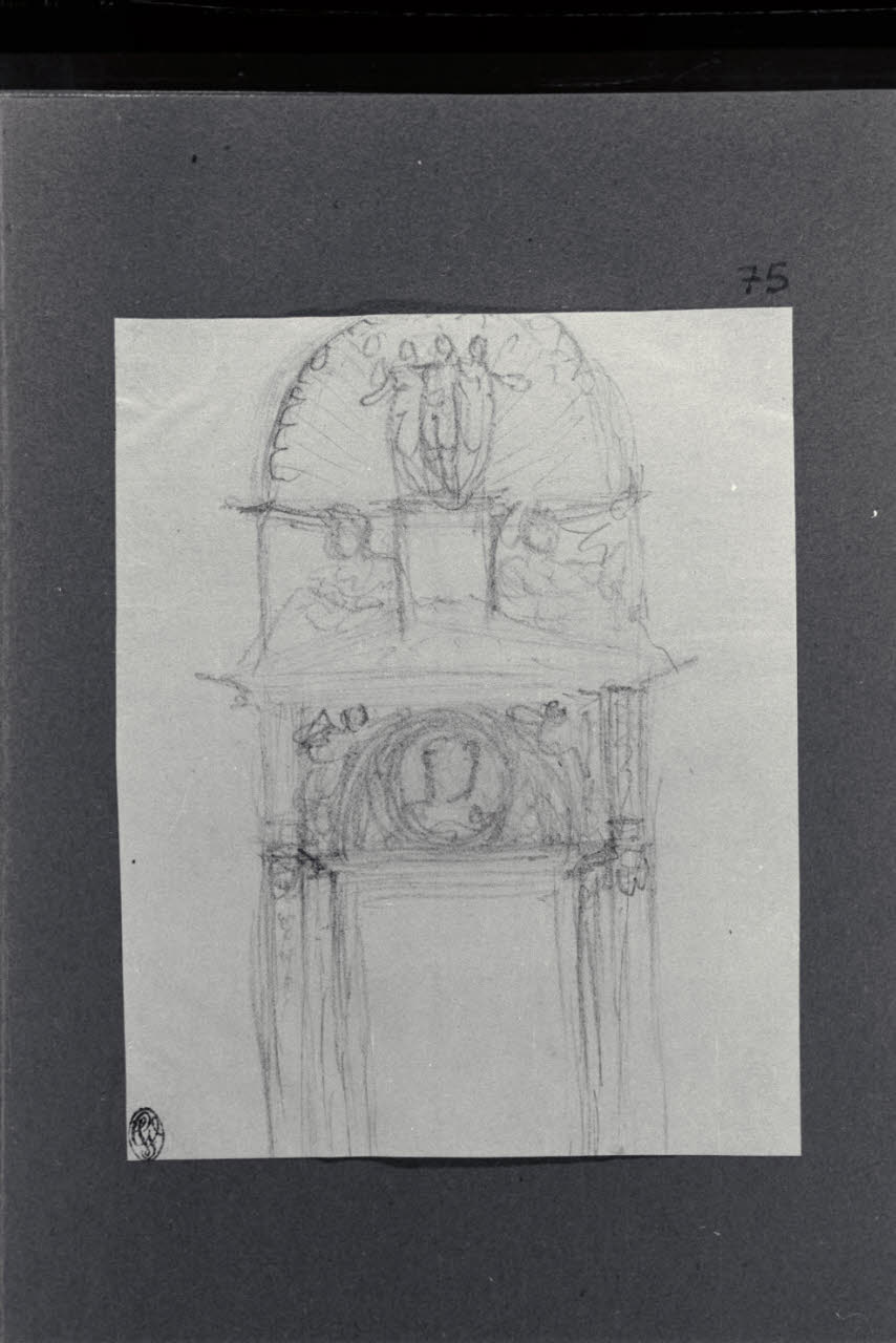 - NOTIZIE STORICO CRITICHE Il disegno fa parte di un album Vallardi del 1840, di dimensioni mm 254 x 295, sulla cui copertina in pelle marrone chiaro è incisa l'iscrizione in lettere capitali dorate "Paolo Landriani / milanese / e suoi contemporanei / nell'arte prospettica valentissimi / questi loro disegni / Giuseppe Vallardi / raccolse per tramandare / co' passati maestri a' futuri / la stabile rinomanza / della scuola lombarda / l'anno MDCCCXL". Ogni singolo disegno è incollato a un foglio dell'album di carta di colore grigio-azzurro.\nLo schizzo, seppur sbrigativo, presenta similitudini con altri disegni, di analogo soggetto, attribuiti a Landriani e custoditi negli album Vallardi.