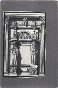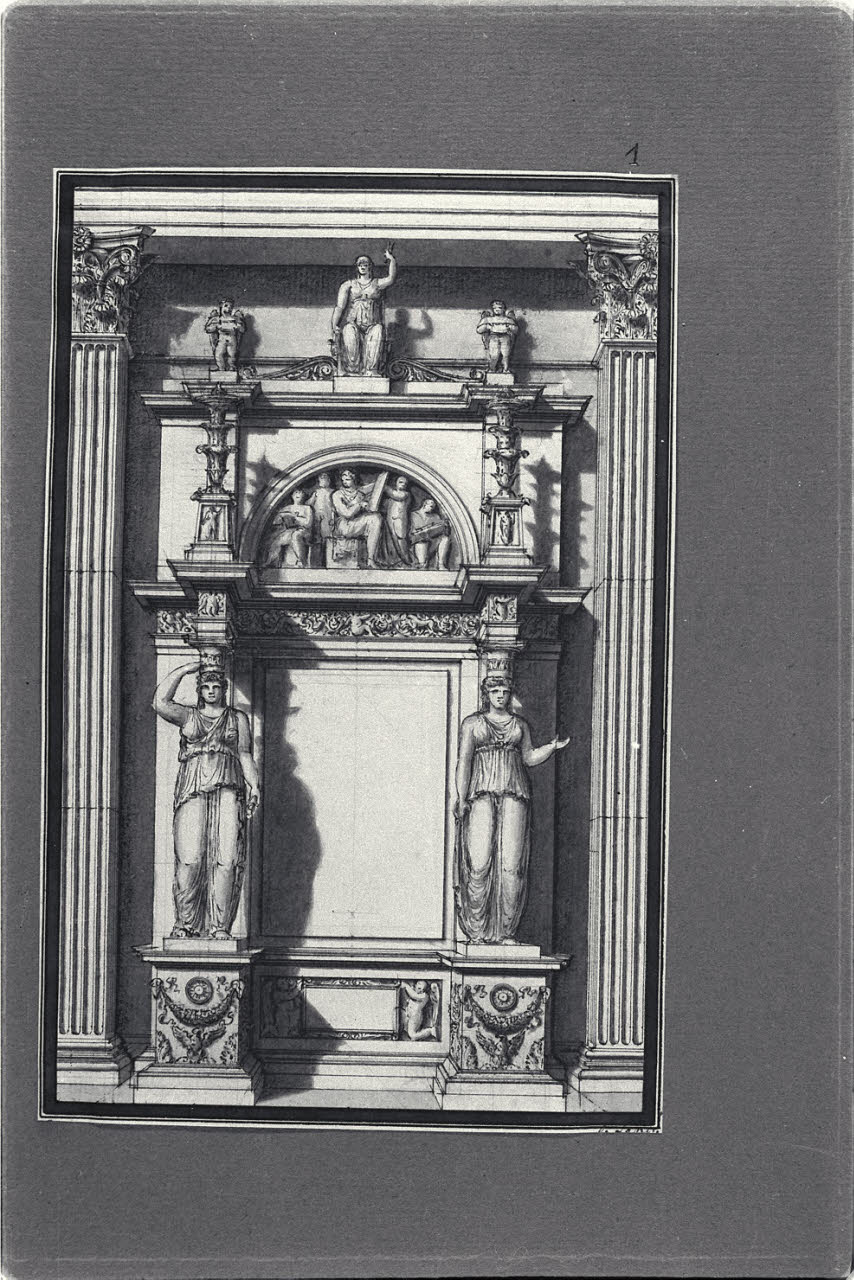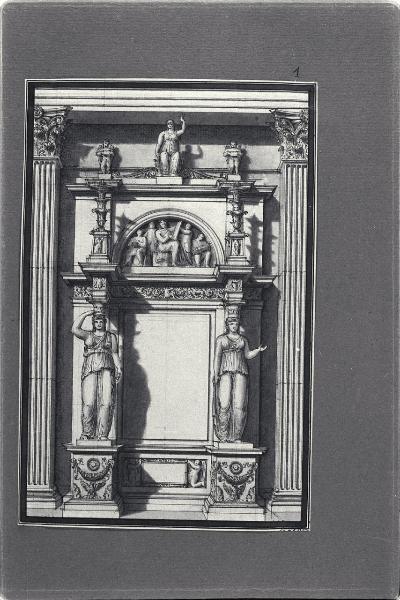 - NOTIZIE STORICO CRITICHE Il disegno fa parte di un album Vallardi del 1840, di dimensioni mm 352 x 460, sulla cui copertina in pelle marrone chiaro è incisa l'iscrizione in lettere capitali dorate "Paolo Landriani / milanese / e suoi contemporanei / nell'arte prospettica valentissimi / questi loro disegni / Giuseppe Vallardi / raccolse / per tramandare / co' passati maestri a' futuri / la stabile rinomanza / della scuola lombarda / l'anno MDCCCXL". Ogni singolo disegno è incollato a un foglio dell'album di carta di colore grigio-azzurro.\nCome desumibile dal confronto con l'opera a stampa incisa da Ferdinando Albertolli, il disegno è uno studio per il frontespizio della "Appendice alle Osservazioni sui teatri e sulle decorazioni" di Paolo Landriani, pubblicata a Milano nel 1824.