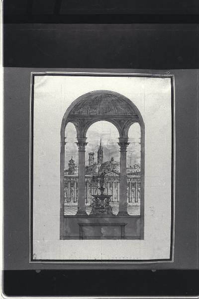 - NOTIZIE STORICO CRITICHE Il disegno fa parte di un album Vallardi del 1840, di dimensioni mm 352 x 460, sulla cui copertina in pelle marrone chiaro è incisa l'iscrizione in lettere capitali dorate "Paolo Landriani / milanese / e suoi contemporanei / nell'arte prospettica valentissimi / questi loro disegni / Giuseppe Vallardi / raccolse / per tramandare / co' passati maestri a' futuri / la stabile rinomanza / della scuola lombarda / l'anno MDCCCXL". Ogni singolo disegno è incollato a un foglio dell'album di carta di colore grigio-azzurro.