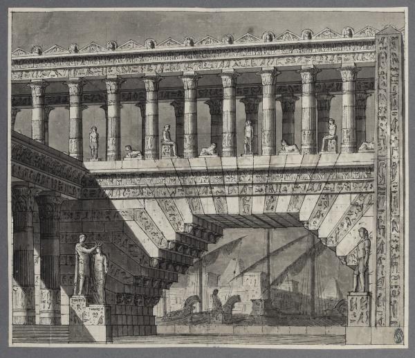 - NOTIZIE STORICO CRITICHE Il disegno fa parte di un album Vallardi del 1840, di dimensioni mm 352 x 460, sulla cui copertina in pelle marrone chiaro è incisa l'iscrizione in lettere capitali dorate "Paolo Landriani / milanese / e suoi contemporanei / nell'arte prospettica valentissimi / questi loro disegni / Giuseppe Vallardi / raccolse / per tramandare / co' passati maestri a' futuri / la stabile rinomanza / della scuola lombarda / l'anno MDCCCXL". Ogni singolo disegno è incollato a un foglio dell'album di carta di colore grigio-azzurro.\nL'opera è un disegno preparatorio per il balletto in cinque atti "Cesare in Egitto", su coreografia di Gaetano Gioia e musiche di Wenzel Robert Gallenberg, andato in scena al Teatro alla Scala nel 1809 alla presenza di Napoleone: per l'occasione, l'imperatore donò al coreografo napoletano un anello e una tabacchiera con monogramma, in segno di apprezzamento. Il disegno corrisponde alla scena I per il I atto; stando alle indicazioni del libretto, questa è la versione poi messa in atto e realizzata: compaiono infatti, in primo piano, la statua di Pompeo che incorona Tolomeo Dionisio sulla sinistra, sul lato opposto una scultura egizia e un'alta stele decorata a geroglifici. In secondo piano due quinte laterali danno vita a una scenografia vivace e di sicuro effetto, un'architettura elaborata sovrastata da un corridoio con doppio colonnato.