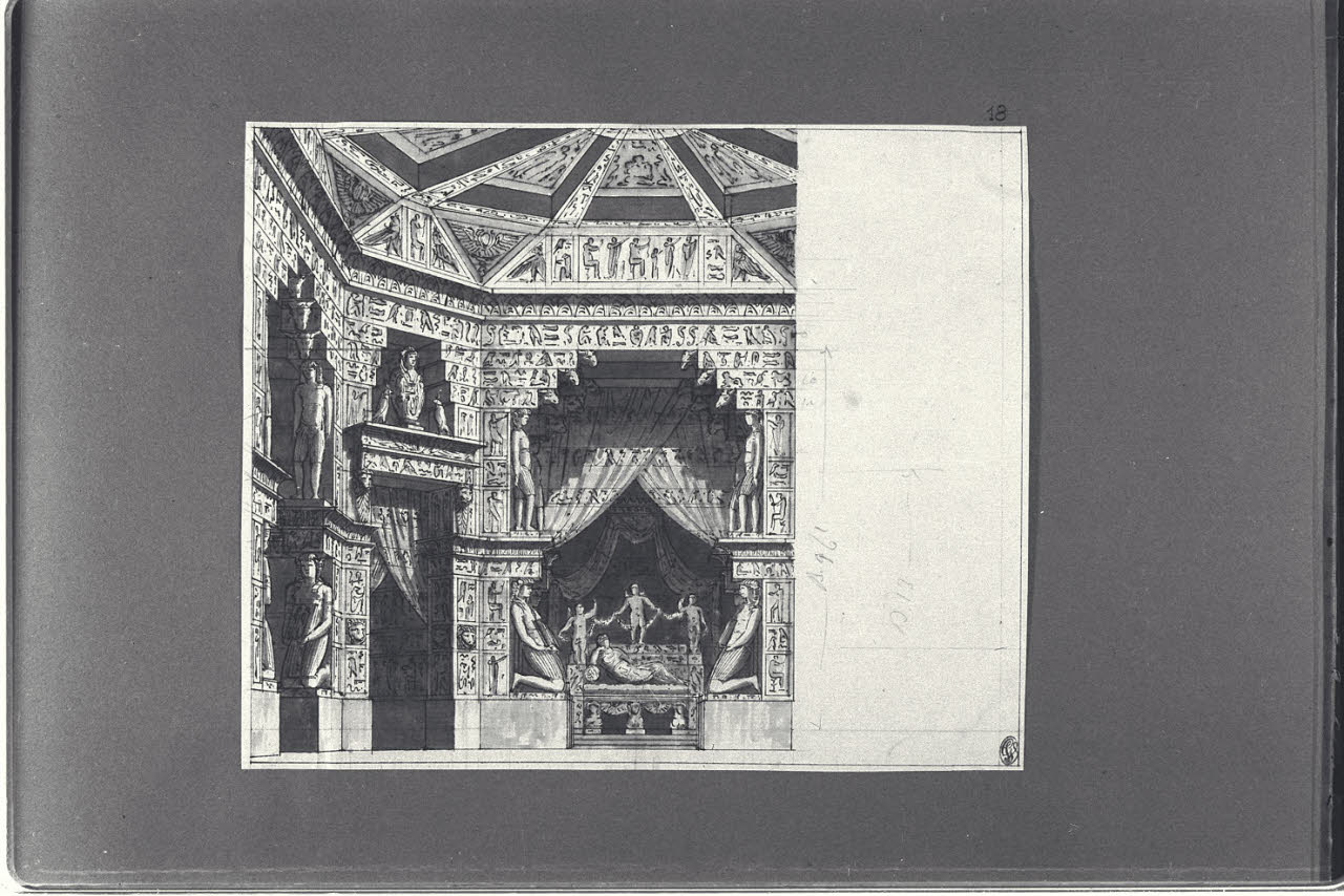 - NOTIZIE STORICO CRITICHE Il disegno fa parte di un album Vallardi del 1840, di dimensioni mm 352 x 460, sulla cui copertina in pelle marrone chiaro è incisa l'iscrizione in lettere capitali dorate "Paolo Landriani / milanese / e suoi contemporanei / nell'arte prospettica valentissimi / questi loro disegni / Giuseppe Vallardi / raccolse / per tramandare / co' passati maestri a' futuri / la stabile rinomanza / della scuola lombarda / l'anno MDCCCXL". Ogni singolo disegno è incollato a un foglio dell'album di carta di colore grigio-azzurro.\nL'opera è un disegno preparatorio per il balletto in cinque atti "Cesare in Egitto", su coreografia di Gaetano Gioia e musiche di Wenzel Robert Gallenberg, andato in scena al Teatro alla Scala nel 1809 alla presenza di Napoleone: per l'occasione, l'imperatore donò al coreografo napoletano un anello e una tabacchiera con monogramma, in segno di apprezzamento. Il disegno, scelto per la messinscena dell'atto II, mostra la lussuosa e ornata alcova di Cleopatra, raffigurata adagiata mollemente su di un triclinio e attorniata dalla sua corte di amori e genietti.