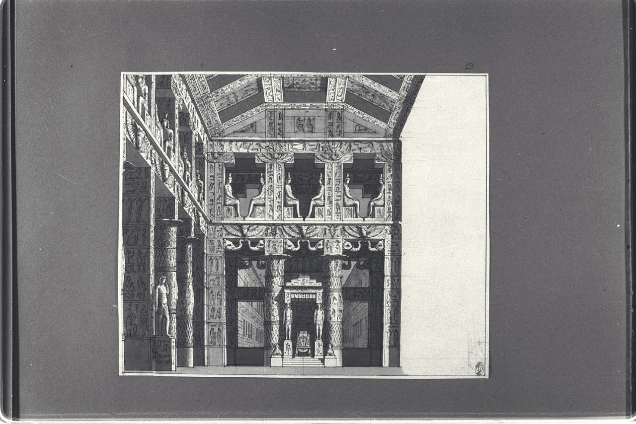 - NOTIZIE STORICO CRITICHE Il disegno fa parte di un album Vallardi del 1840, di dimensioni mm 352 x 460, sulla cui copertina in pelle marrone chiaro è incisa l'iscrizione in lettere capitali dorate "Paolo Landriani / milanese / e suoi contemporanei / nell'arte prospettica valentissimi / questi loro disegni / Giuseppe Vallardi / raccolse / per tramandare / co' passati maestri a' futuri / la stabile rinomanza / della scuola lombarda / l'anno MDCCCXL". Ogni singolo disegno è incollato a un foglio dell'album di carta di colore grigio-azzurro.\nL'opera è un disegno preparatorio per il balletto in cinque atti "Cesare in Egitto", su coreografia di Gaetano Gioia e musiche di Wenzel Robert Gallenberg, andato in scena al Teatro alla Scala nel 1809 alla presenza di Napoleone: per l'occasione, l'imperatore donò al coreografo napoletano un anello e una tabacchiera con monogramma, in segno di apprezzamento. Il disegno è una variante, poi non realizzata, della scena dell'atto III: sul fondo, dietro il trono in prospetto, vediamo lo schizzo di due palazzi allineati, mentre il libretto riporta l'indicazione "Logge che guardano il Nilo". Come sottolineato da Amalia Pacia nel suo catalogo del 1977, pur essendo stato scartato lo studio rivela una cura maniacale nel dettaglio e un gusto raffinato per l'esuberante apparato decorativo della sala.