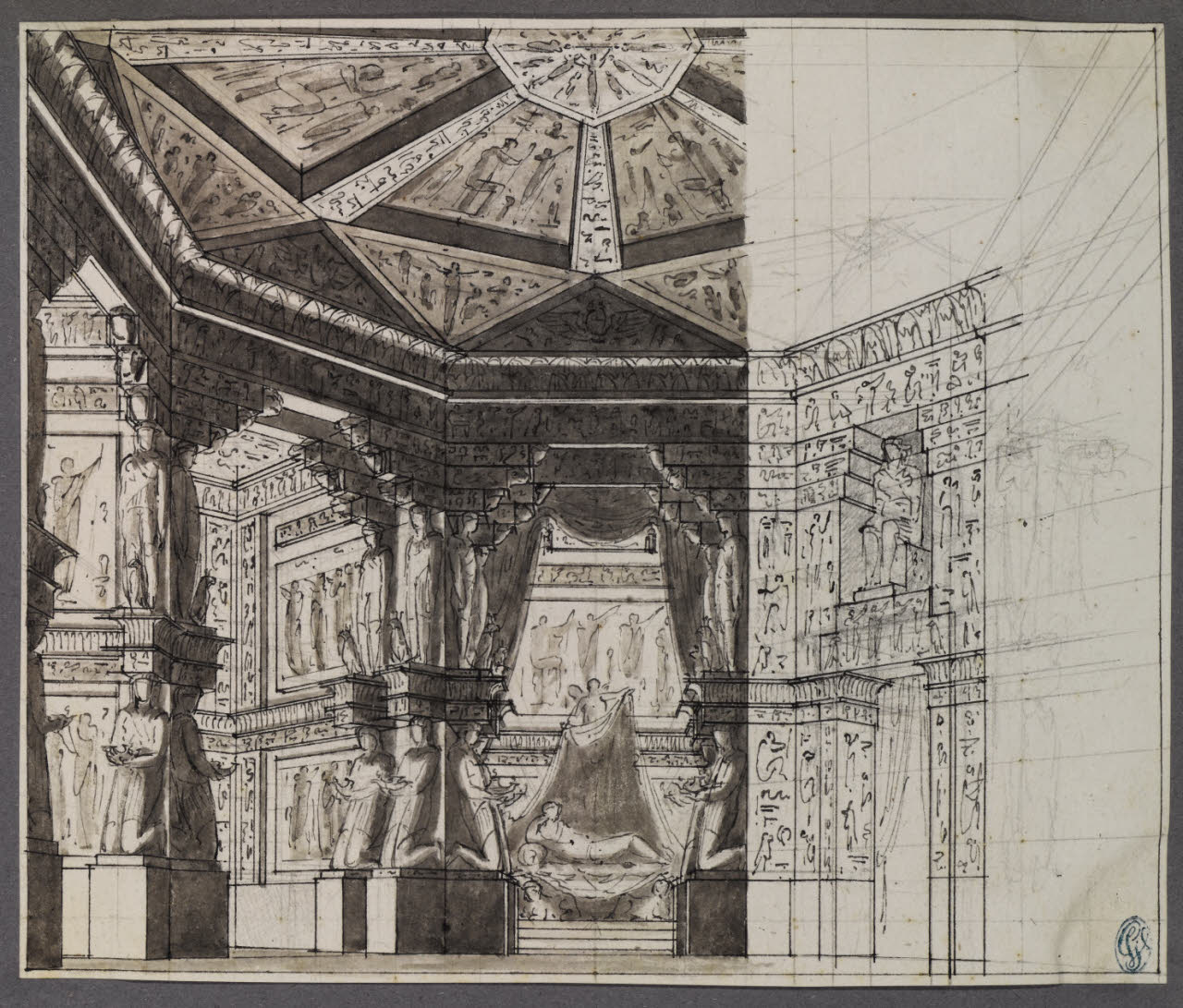 - NOTIZIE STORICO CRITICHE Il disegno fa parte di un album Vallardi del 1840, di dimensioni mm 352 x 460, sulla cui copertina in pelle marrone chiaro è incisa l'iscrizione in lettere capitali dorate "Paolo Landriani / milanese / e suoi contemporanei / nell'arte prospettica valentissimi / questi loro disegni / Giuseppe Vallardi / raccolse / per tramandare / co' passati maestri a' futuri / la stabile rinomanza / della scuola lombarda / l'anno MDCCCXL". Ogni singolo disegno è incollato a un foglio dell'album di carta di colore grigio-azzurro.\nL'opera è un disegno preparatorio per il balletto in cinque atti "Cesare in Egitto", su coreografia di Gaetano Gioia e musiche di Wenzel Robert Gallenberg, andato in scena al Teatro alla Scala nel 1809 alla presenza di Napoleone: per l'occasione, l'imperatore donò al coreografo napoletano un anello e una tabacchiera con monogramma, in segno di apprezzamento. Il disegno è una variante (poi scartata) per la messinscena dell'atto II, e mostra la lussuosa e ornata alcova di Cleopatra, raffigurata adagiata mollemente su di un triclinio e con un solo angelo reggicortina, diversamente da quanto scritto nelle indicazioni del libretto.
