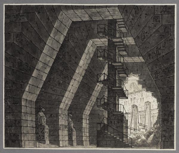 - NOTIZIE STORICO CRITICHE Il disegno fa parte di un album Vallardi del 1840, di dimensioni mm 352 x 460, sulla cui copertina in pelle marrone chiaro è incisa l'iscrizione in lettere capitali dorate "Paolo Landriani / milanese / e suoi contemporanei / nell'arte prospettica valentissimi / questi loro disegni / Giuseppe Vallardi / raccolse / per tramandare / co' passati maestri a' futuri / la stabile rinomanza / della scuola lombarda / l'anno MDCCCXL". Ogni singolo disegno è incollato a un foglio dell'album di carta di colore grigio-azzurro.\nL'opera è un disegno preparatorio per il balletto in cinque atti "Cesare in Egitto", su coreografia di Gaetano Gioia e musiche di Wenzel Robert Gallenberg, andato in scena al Teatro alla Scala nel 1809 alla presenza di Napoleone: per l'occasione, l'imperatore donò al coreografo napoletano un anello e una tabacchiera con monogramma, in segno di apprezzamento. Il disegno raffigura la scena del quinto e ultimo atto, nella quale Cleopatra, imprigionata in un sotterraneo, viene liberata dagli arieti di Cesare. Al centro si innalza una scala a chiocciola avvolta attorno a un imponente pilastro; sul fondo vediamo un muro diroccato e, in lontananza, le macchine da guerra romane e gli edifici di Alessandria.