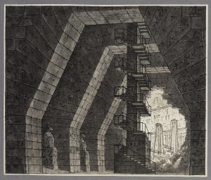 Oscuro ed orrido luogo all'interno della reggia con scala a chiocciola (per "Cesare in Egitto")