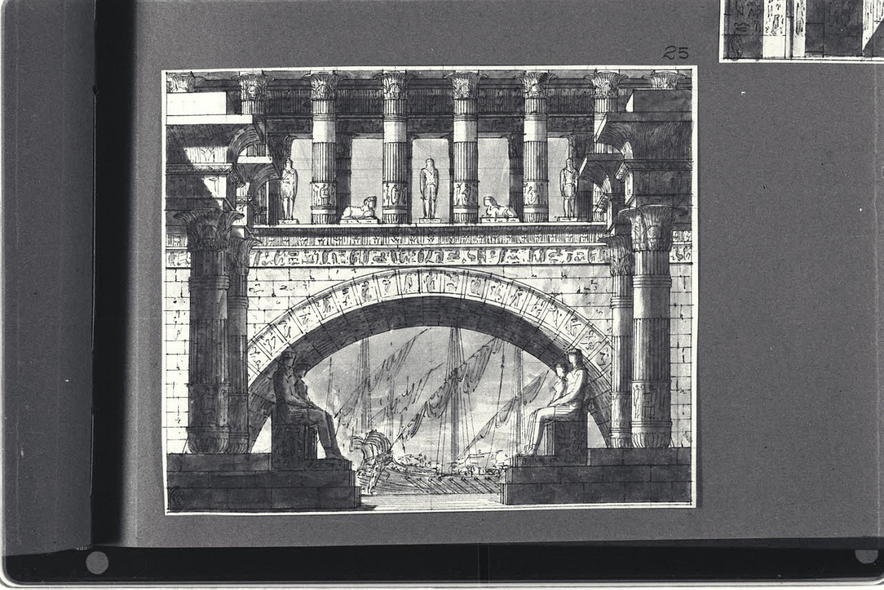 - NOTIZIE STORICO CRITICHE Il disegno fa parte di un album Vallardi del 1840, di dimensioni mm 352 x 460, sulla cui copertina in pelle marrone chiaro è incisa l'iscrizione in lettere capitali dorate "Paolo Landriani / milanese / e suoi contemporanei / nell'arte prospettica valentissimi / questi loro disegni / Giuseppe Vallardi / raccolse / per tramandare / co' passati maestri a' futuri / la stabile rinomanza / della scuola lombarda / l'anno MDCCCXL". Ogni singolo disegno è incollato a un foglio dell'album di carta di colore grigio-azzurro.\nL'opera è un disegno preparatorio per il balletto in cinque atti "Cesare in Egitto", su coreografia di Gaetano Gioia e musiche di Wenzel Robert Gallenberg, andato in scena al Teatro alla Scala nel 1809 alla presenza di Napoleone: per l'occasione, l'imperatore donò al coreografo napoletano un anello e una tabacchiera con monogramma, in segno di apprezzamento. Il disegno corrisponde alla scena I per il I atto; stando alle indicazioni del libretto, questa versione venne scartata. Rispetto a quella poi messa in atto, qui la composizione è maggiormente drammatica, ravvicinata e concentrata nei primi piani, con un taglio monumentale conferito dalle coppie di statue su alti piedistalli e dalle imponenti colonne reggenti massicci architravi.