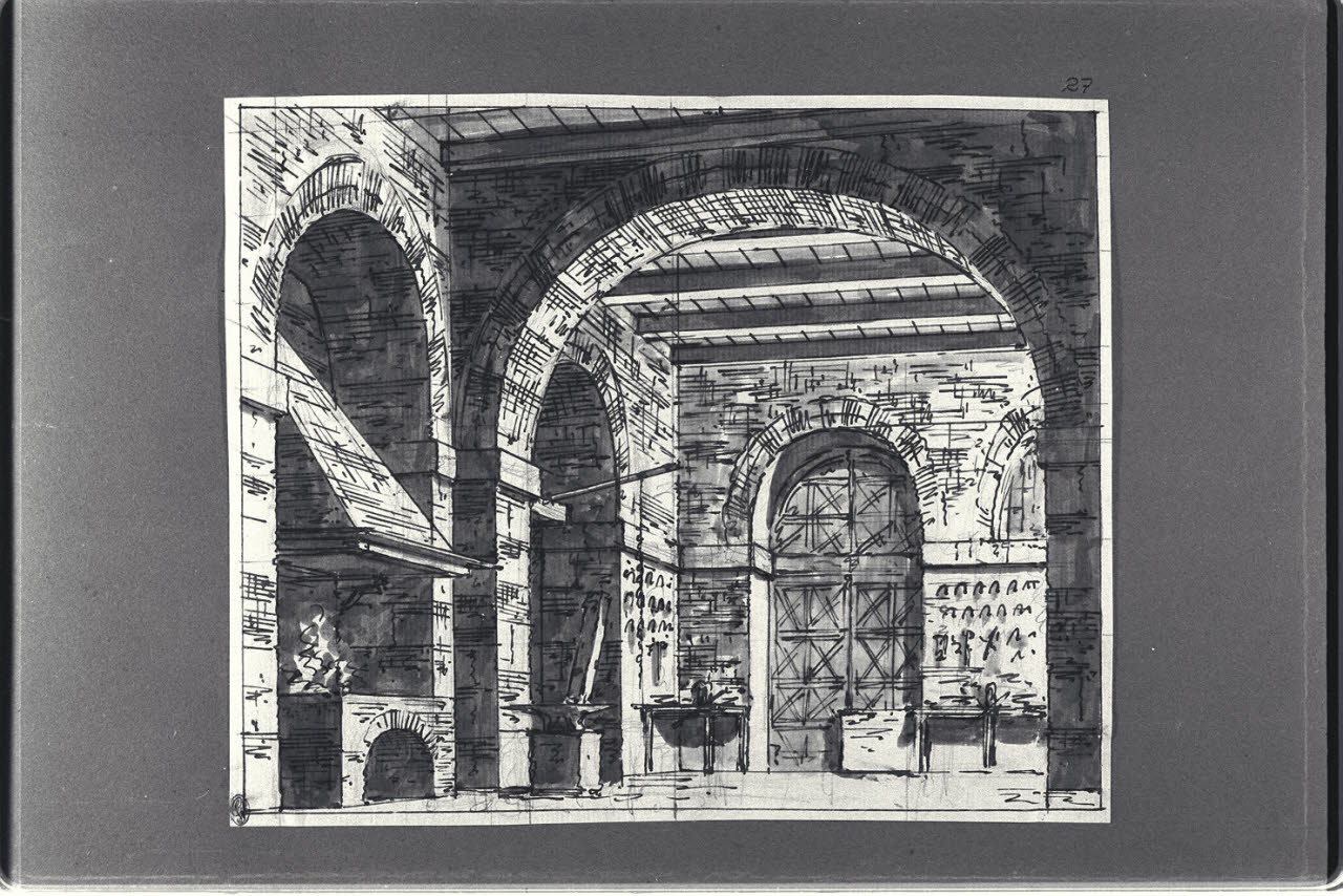- NOTIZIE STORICO CRITICHE Il disegno fa parte di un album Vallardi del 1840, di dimensioni mm 352 x 460, sulla cui copertina in pelle marrone chiaro è incisa l'iscrizione in lettere capitali dorate "Paolo Landriani / milanese / e suoi contemporanei / nell'arte prospettica valentissimi / questi loro disegni / Giuseppe Vallardi / raccolse / per tramandare / co' passati maestri a' futuri / la stabile rinomanza / della scuola lombarda / l'anno MDCCCXL". Ogni singolo disegno è incollato a un foglio dell'album di carta di colore grigio-azzurro.