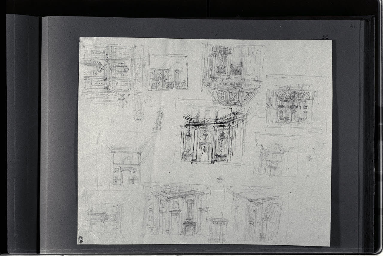 - NOTIZIE STORICO CRITICHE Il disegno fa parte di un album Vallardi del 1840, di dimensioni mm 352 x 460, sulla cui copertina in pelle marrone chiaro è incisa l'iscrizione in lettere capitali dorate "Paolo Landriani / milanese / e suoi contemporanei / nell'arte prospettica valentissimi / questi loro disegni / Giuseppe Vallardi / raccolse / per tramandare / co' passati maestri a' futuri / la stabile rinomanza / della scuola lombarda / l'anno MDCCCXL". Ogni singolo disegno è incollato a un foglio dell'album di carta di colore grigio-azzurro.\nIl disegno presenta, sul verso, schizzi architettonici e di figure a grafite.