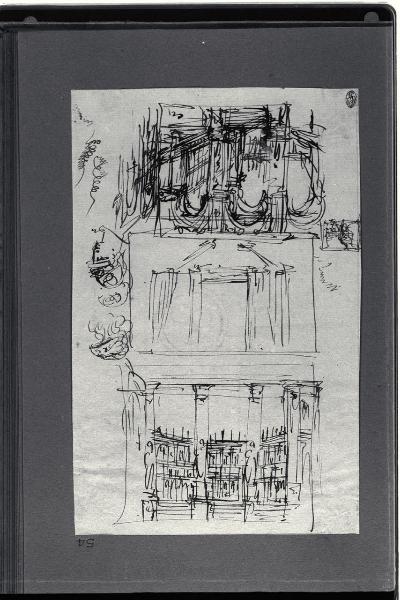 - NOTIZIE STORICO CRITICHE Il disegno fa parte di un album Vallardi del 1840, di dimensioni mm 352 x 460, sulla cui copertina in pelle marrone chiaro è incisa l'iscrizione in lettere capitali dorate "Paolo Landriani / milanese / e suoi contemporanei / nell'arte prospettica valentissimi / questi loro disegni / Giuseppe Vallardi / raccolse / per tramandare / co' passati maestri a' futuri / la stabile rinomanza / della scuola lombarda / l'anno MDCCCXL". Ogni singolo disegno è incollato a un foglio dell'album di carta di colore grigio-azzurro.