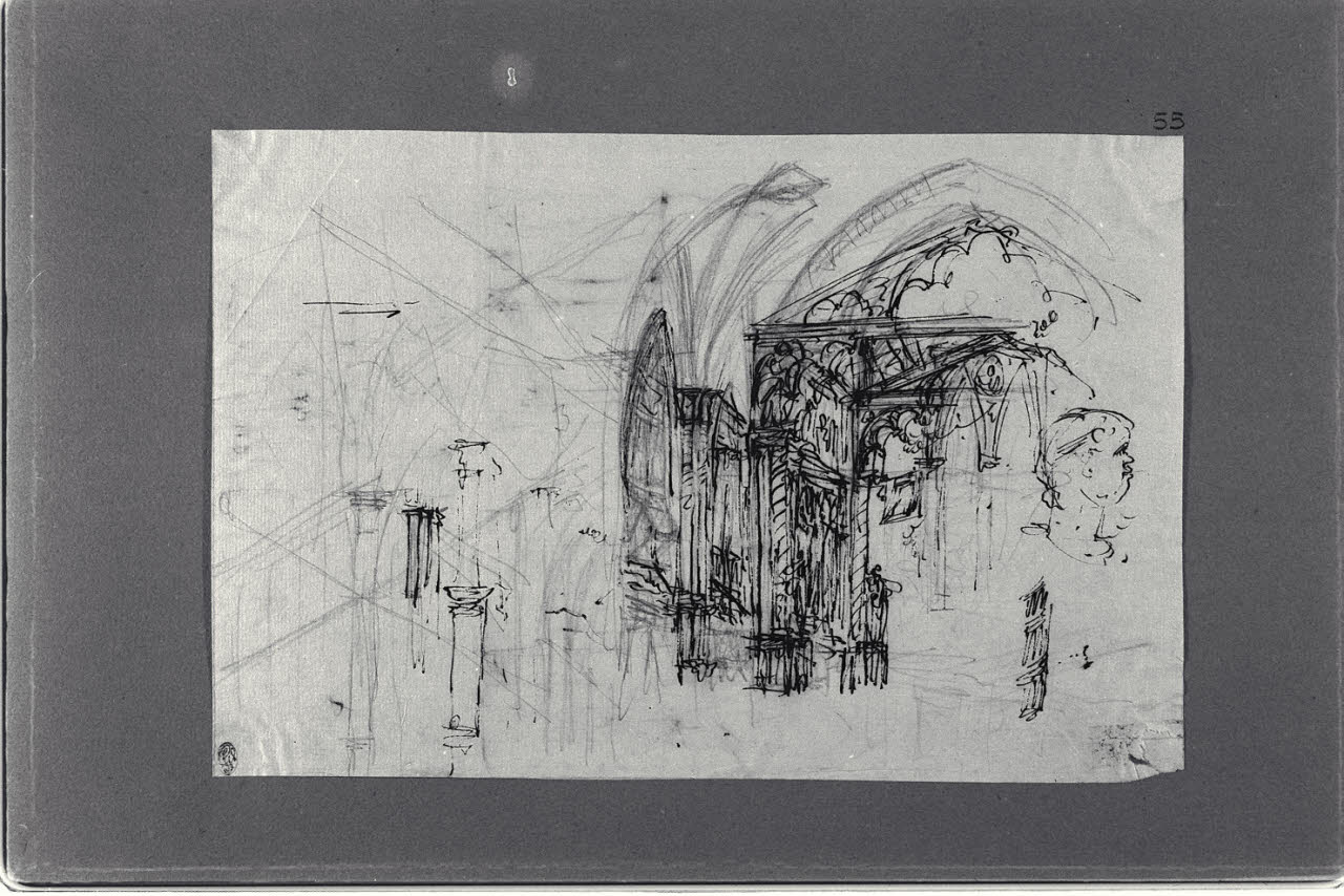 - NOTIZIE STORICO CRITICHE Il disegno fa parte di un album Vallardi del 1840, di dimensioni mm 352 x 460, sulla cui copertina in pelle marrone chiaro è incisa l'iscrizione in lettere capitali dorate "Paolo Landriani / milanese / e suoi contemporanei / nell'arte prospettica valentissimi / questi loro disegni / Giuseppe Vallardi / raccolse / per tramandare / co' passati maestri a' futuri / la stabile rinomanza / della scuola lombarda / l'anno MDCCCXL". Ogni singolo disegno è incollato a un foglio dell'album di carta di colore grigio-azzurro.