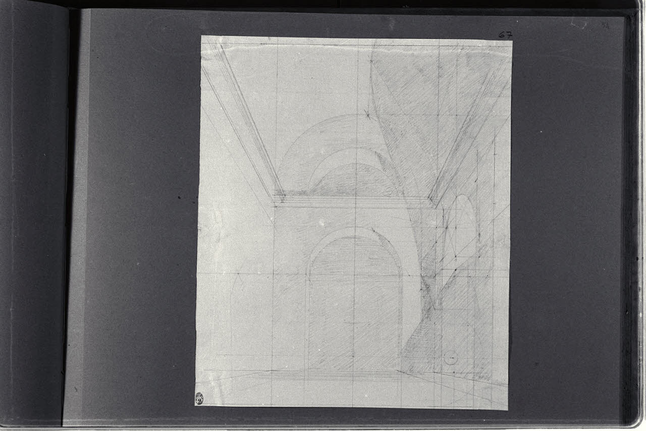 - NOTIZIE STORICO CRITICHE Il disegno fa parte di un album Vallardi del 1840, di dimensioni mm 352 x 460, sulla cui copertina in pelle marrone chiaro è incisa l'iscrizione in lettere capitali dorate "Paolo Landriani / milanese / e suoi contemporanei / nell'arte prospettica valentissimi / questi loro disegni / Giuseppe Vallardi / raccolse / per tramandare / co' passati maestri a' futuri / la stabile rinomanza / della scuola lombarda / l'anno MDCCCXL". Ogni singolo disegno è incollato a un foglio dell'album di carta di colore grigio-azzurro.