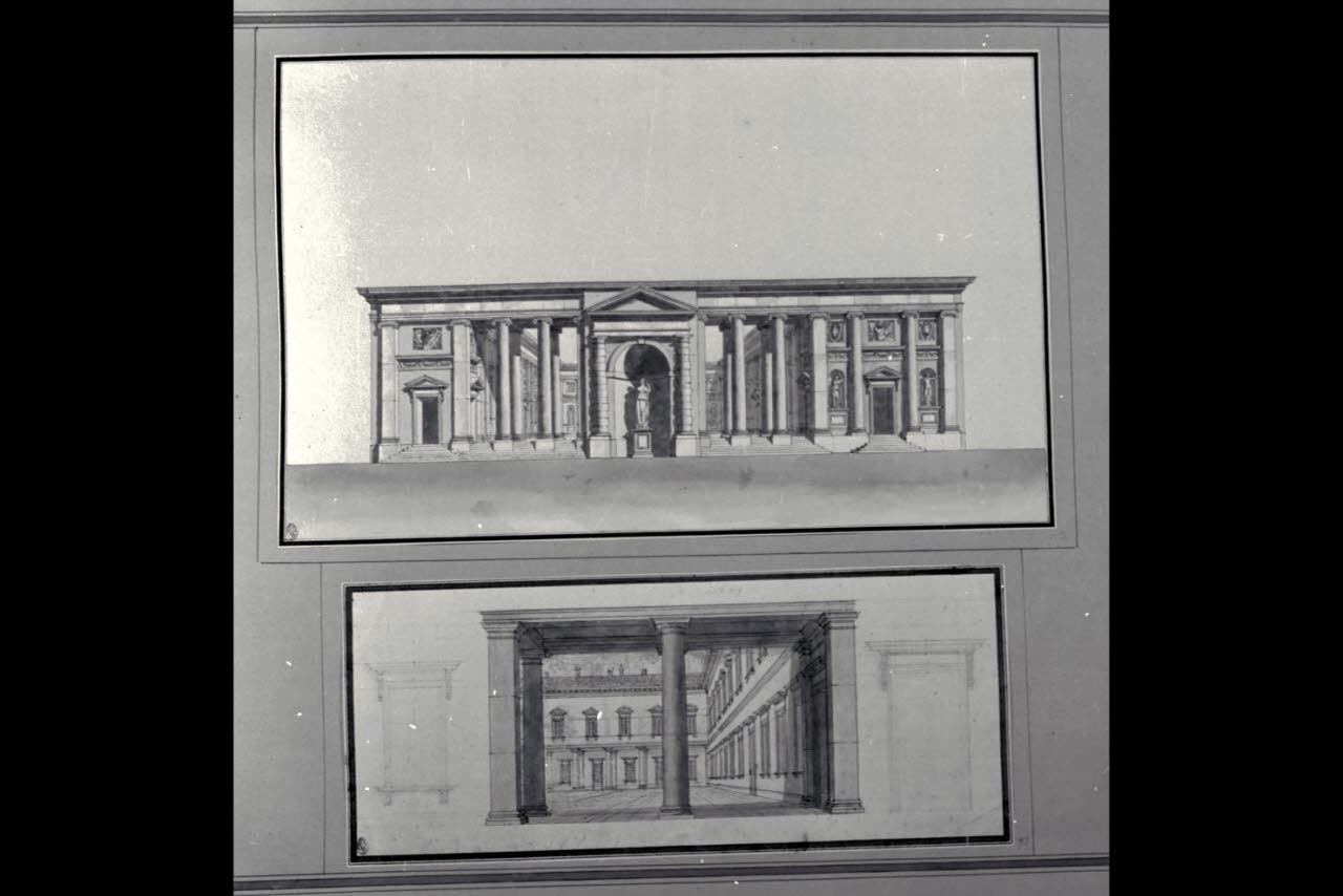 - NOTIZIE STORICO CRITICHE Il disegno fa parte di un album Vallardi del 1840, di dimensioni mm 561 x 735, sulla cui copertina in pelle marrone è incisa l'iscrizione in lettere capitali dorate "Paolo Landriani / milanese / e suoi contemporanei / nell'arte prospettica valentissimi. / Questi loro disegni / Giuseppe Vallardi / raccolse / per tramandare / co' passati maestri a' futuri / la stabile rinomanza / della scuola lombarda / l'anno MDCCCXL.". Ogni singolo disegno è incollato a un foglio dell'album, di carta grigia, presentante una cornice realizzata a penna e pennello e inchiostro sui toni del grigio.
