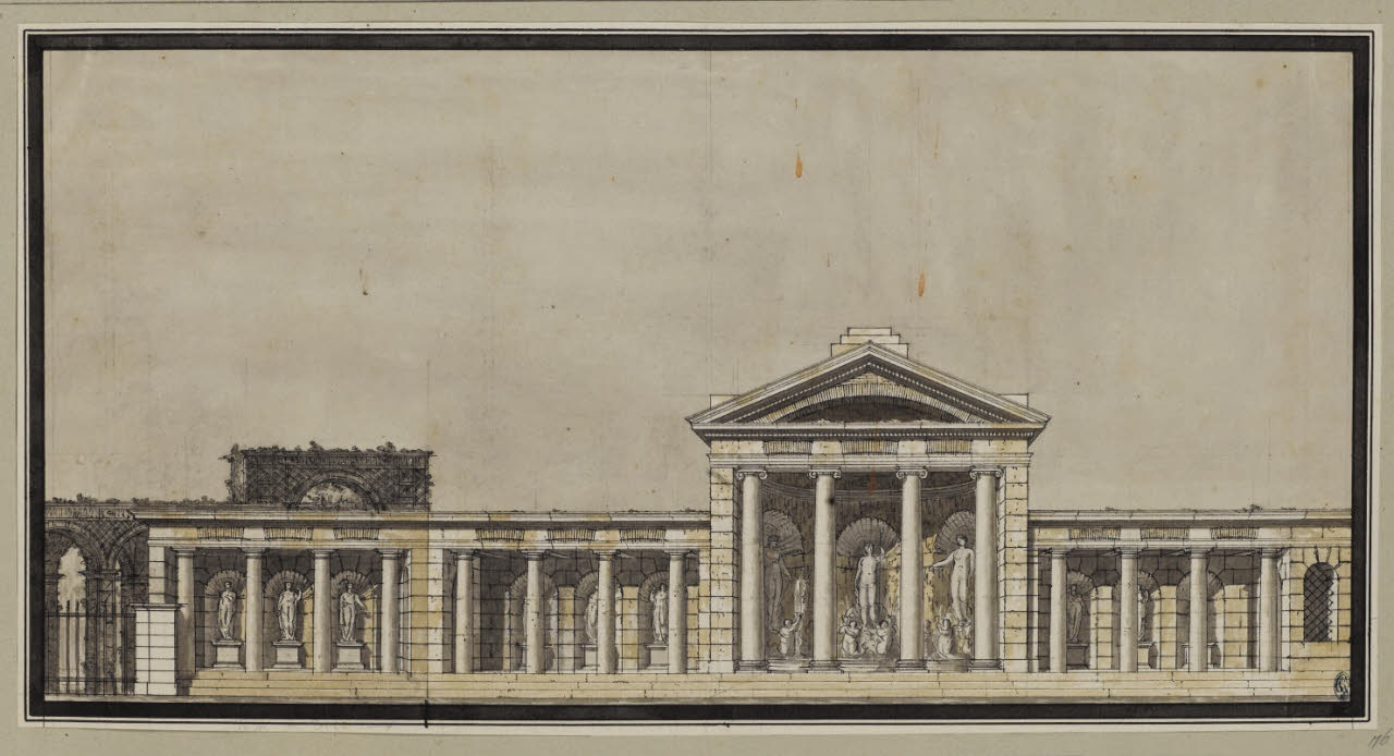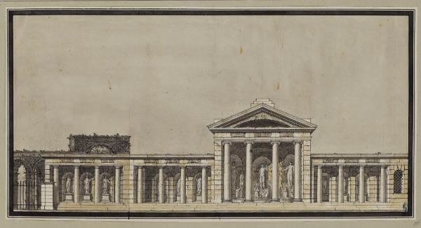 - NOTIZIE STORICO CRITICHE Il disegno fa parte di un album Vallardi del 1840, di dimensioni mm 561 x 735, sulla cui copertina in pelle marrone è incisa l'iscrizione in lettere capitali dorate "Paolo Landriani / milanese / e suoi contemporanei / nell'arte prospettica valentissimi. / Questi loro disegni / Giuseppe Vallardi / raccolse / per tramandare / co' passati maestri a' futuri / la stabile rinomanza / della scuola lombarda / l'anno MDCCCXL.". Ogni singolo disegno è incollato a un foglio dell'album, di carta grigia, presentante una cornice realizzata a penna e pennello e inchiostro sui toni del grigio.\nNel 1807 Giocondo Albertolli, Luigi Cagnola, Luigi Canonica, Paolo Landriani e Giuseppe Zanoia costituiscono la Commissione d'Ornato: ad essa è affidato il compito di conferire adeguato ordine alla città di Milano e di disciplinare l'edilizia privata. La città, ripartita in cinque zone, è sottoposta al controllo di ciascun artista: il Landriani si occupa dell'area compresa tra Porta Tosa e Porta della Riconoscenza, la vecchia area asburgica di Porta Orientale. Lo studio in analisi riguarda l'edificazione di un'ala del cimitero di Porta Tosa,