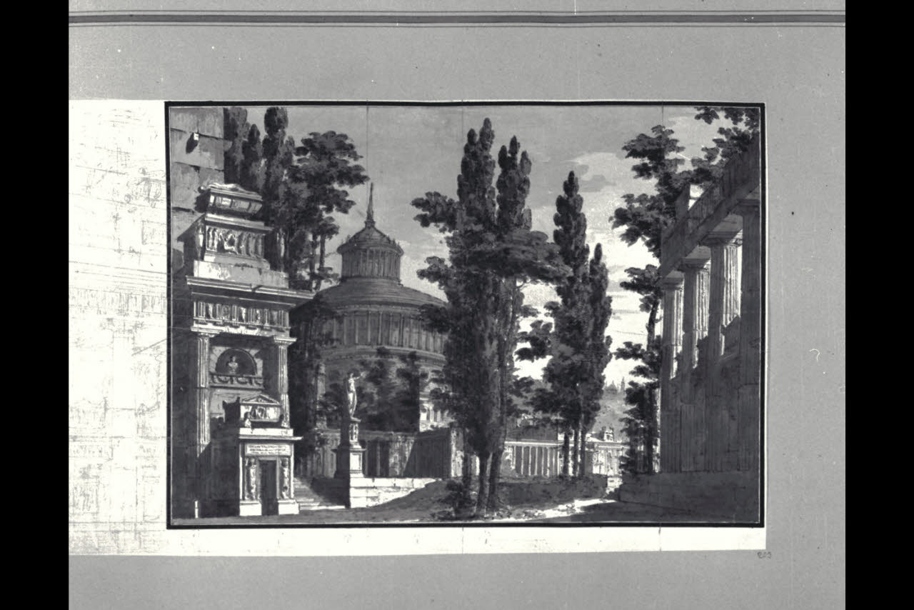 - NOTIZIE STORICO CRITICHE Il disegno fa parte di un album Vallardi del 1840, di dimensioni mm 561 x 735, sulla cui copertina in pelle marrone è incisa l'iscrizione in lettere capitali dorate "Paolo Landriani / milanese / e suoi contemporanei / nell'arte prospettica valentissimi. / Questi loro disegni / Giuseppe Vallardi / raccolse / per tramandare / co' passati maestri a' futuri / la stabile rinomanza / della scuola lombarda / l'anno MDCCCXL.". Ogni singolo disegno è incollato a un foglio dell'album, di carta grigia, presentante una cornice realizzata a penna e pennello e inchiostro sui toni del grigio.\nLa veduta con rovine mostra una particolare attenzione anche all'aspetto naturalistico, dando spazio a inserti di vegetazione. Il disegno documenta, inoltre, la cultura archeologica di Landriani che, nella parte superiore del mausoleo, cita la Mole Adriana (attuale Castel Sant'Angelo), nella sequenza di arcate cieche della fascia inferiore rimanda invece al Pantheon.