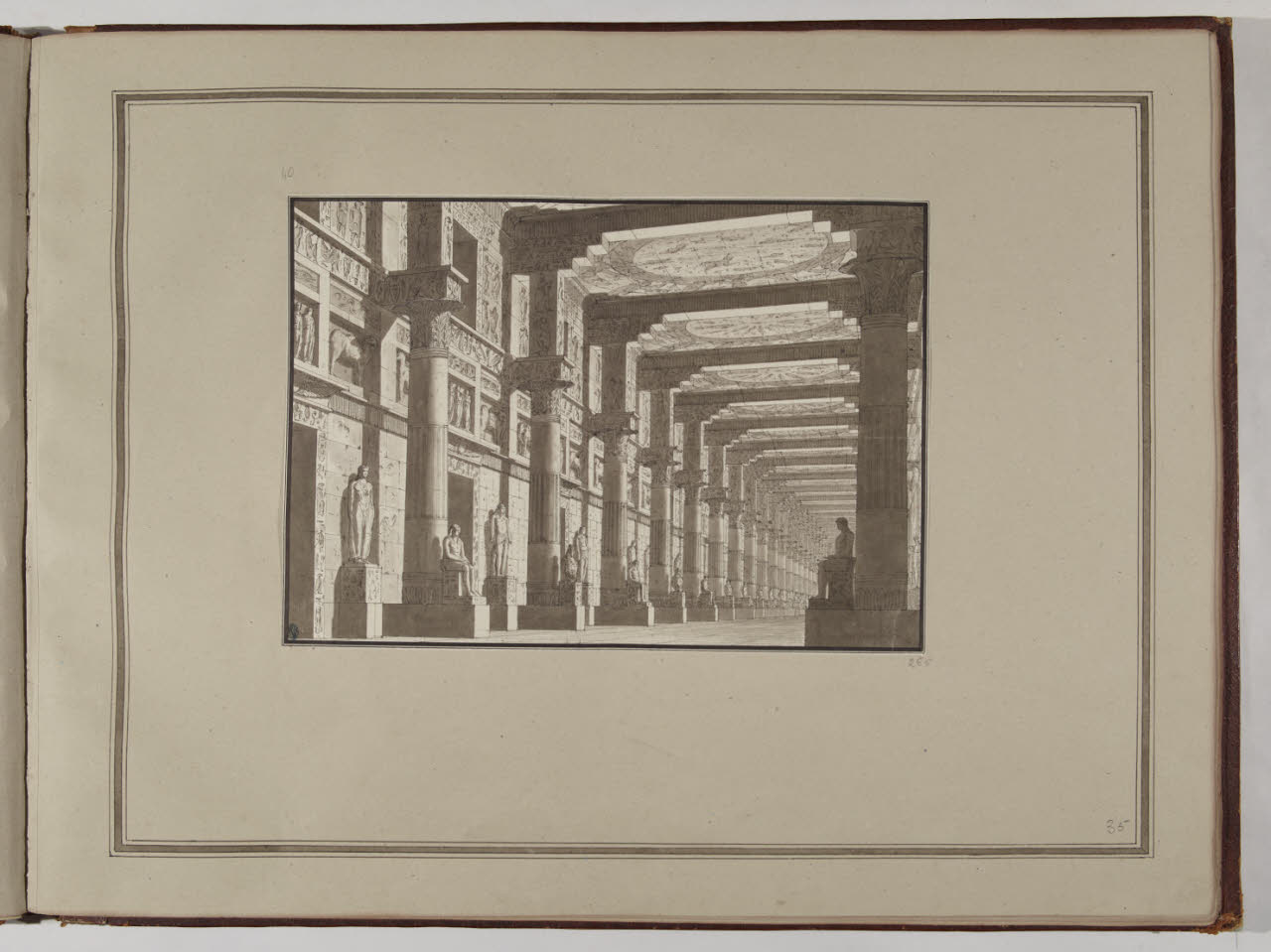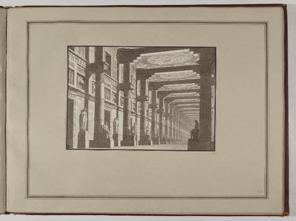 - NOTIZIE STORICO CRITICHE Il disegno fa parte di un album Vallardi del 1840, di dimensioni mm 561 x 735, sulla cui copertina in pelle marrone è incisa l'iscrizione in lettere capitali dorate "Paolo Landriani / milanese / e suoi contemporanei / nell'arte prospettica valentissimi. / Questi loro disegni / Giuseppe Vallardi / raccolse / per tramandare / co' passati maestri a' futuri / la stabile rinomanza / della scuola lombarda / l'anno MDCCCXL.". Ogni singolo disegno è incollato a un foglio dell'album, di carta grigia, presentante una cornice realizzata a penna e pennello e inchiostro sui toni del grigio.\nProbabilmente la scena, di chiara ambientazione egizia, potrebbe essere un bozzetto teatrale. Amalia Pacia, nel suo catalogo del 1977, esclude che possa essere collegata al ballo "Cesare in Egitto".