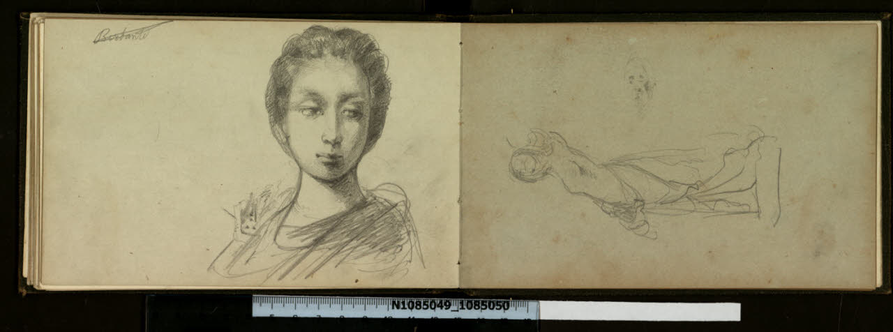 Studio di volto femminile; a rovescio, quasi incorporata nella spalla sinistra, testa maschile in miniatura