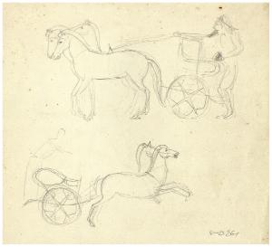 Due studi di carri antichi (disegno preparatorio per copertina di F. Nietzsche, La volontà di potenza, Milano, F.lli Bocca, 1937?)