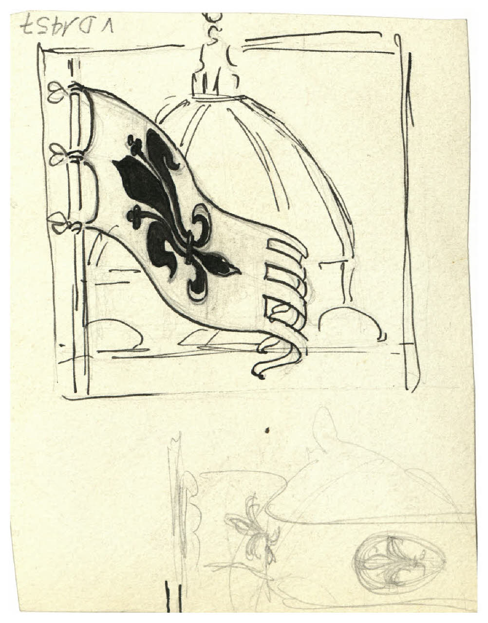 Cupola di S. Maria del Fiore e gonfalone con stemma della città di Firenze (disegno preparatorio per la copertina di Yambo, Il diavolo nella cupola, Milano, Mondadori, 1930)