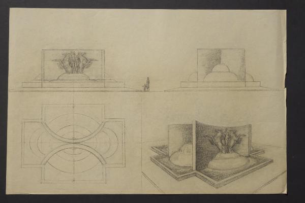 Pianta, vista laterale e parziale della fontana di Epona tra i cavalli