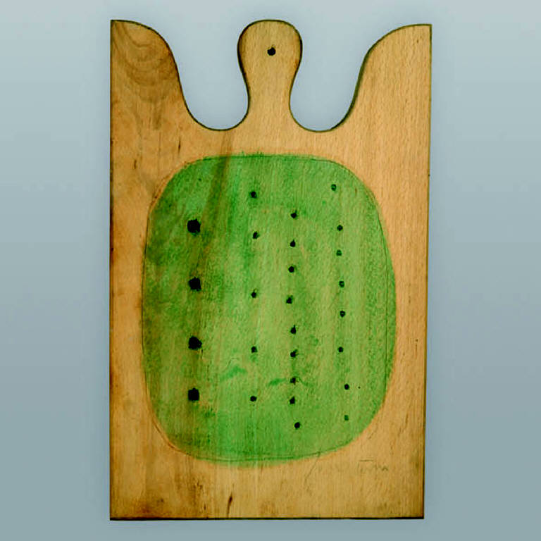 Il supporto, parte integrante dell'opera, consiste in un comune tagliere da cucina con la sua caratteristica forma rettangolare movimentata in alto dal tipico ritaglio curvilineo. La superficie di legno è solcata da "buchi" dal diametro e profondità eterogenei, operati dall'artista ricorrendo all'utilizzo del trapano e che, a seconda dell'incidenza e dell'inclinazione della sorgente luminosa, generano piccole ombre. La sequenza di fori, disposti in prevalenza nella parte centrale - secondo un percorso che crea un ritmo visivo - è inquadrata, mediante segni incisi e l'uso della matita, da una cornice irregolare di forma ovale colorata al suo interno di verde con acrilico steso a larghe e veloci campiture.