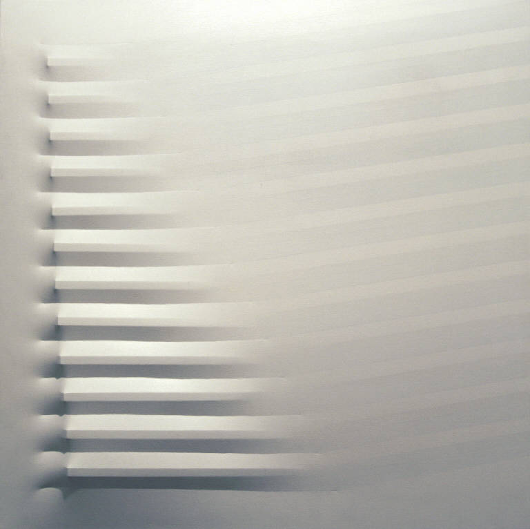- NOTIZIE STORICO CRITICHE Nell'opera prevale una certa vocazione tridimensionale: il supporto si anima di forme aggettanti in modo da creare giochi ed effetti di chiaro scuro che mutano a seconda dell'incidenza della luce sulla superficie. \nNegli anni dell'adesione ad Azimuth, insieme anche a Enrico Castellani e Piero Manzoni, Agostino Bonalumi sperimenta un nuovo linguaggio a metà tra pittura e scultura, trasformando la tela in bassorilievo al punto tale da conferire alle sue opere un forte impatto e valore plastico. Affascinato dalle sperimentazioni di Lucio Fontana e dalle problematiche in ambito spaziale innescate dalla sua opera, la ricerca di Bonalumi, in parte influenzata dagli studi giovanili di disegno tecnico e meccanico, si concreta nel controllo rigoroso dei mezzi espressivi. Estroflessioni ed introflessioni del supporto - attuate mediante la disposizione regolare di strutture rigide, come chiodi, centine, telai incurvati, sagome di legno o di metallo che dilatano tridimensionalmente la superficie dipinta ponendola in un nuovo rapporto con lo spettatore - si accompagnano, in modo costante, alla colorazione monocroma della tela.\nDa una parte l'impianto pittorico diventa tridimensionale, dall'altro l'immagine plastica prodotta si pone come trasgressione, sfida nei confronti della bidimensionalità. Il quadro si fa dunque oggetto che si estende e interagisce con l'ambiente circostante. Procedendo attraverso un progetto e un disegno che denotano una perizia artigianale, l'artista si accosta alla tela con una prassi scientifica ed oggettiva. È evidente nelle sue opere il rifiuto di qualsiasi vena esistenzialista o neorealista e la rinuncia a un'emotività soggettiva che conduce allo svuotamento della tela da segni, gesti, materie e colori che appartenevano al retaggio dell'arte informale. In anni più recenti Bonalumi sembra volgersi maggiormente ad uno studio più analitico delle potenzialità illusorie della luce e dei fenomeni percettivi da essa innescati, mentre le estroflessioni modulari degli anni precedenti cederanno il passo a favore di aggetti irregolari.